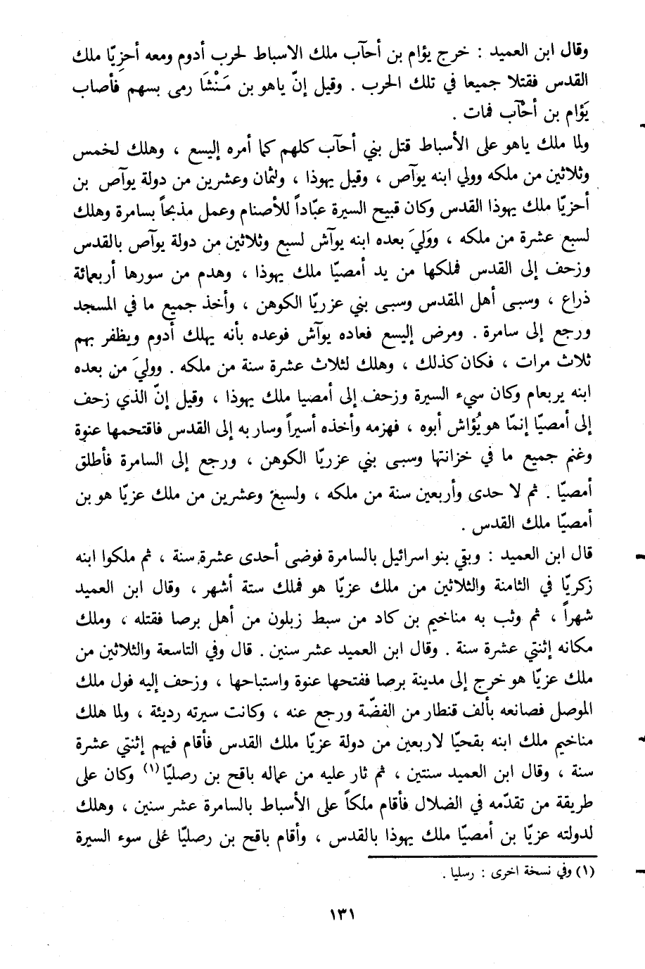 ثلاث مرات، فكان كذلك، وهلك لثلاث عشرة سنة من ملكه. وولي من بعده ابنه يربعام وكان سيّئ السيرة وزحف إلى أمصيا ملك يهوذا، وقيل إنّ الّذي زحف إلى أمصيّا إنّما هو يؤاش أبوه، فهزمه وأخذه أسيرا وسار به إلى القدس فاقتحمها عنوة وغنم جميع ما في خزانتها وسبى بني عزريّا الكوهن، ورجع إلى السامرة فأطلق أمصيّا. ثم لإحدى وأربعين سنة من ملكه، ولسبع وعشرين من ملك عزيّا هو بن أمصيّا ملك القدس.