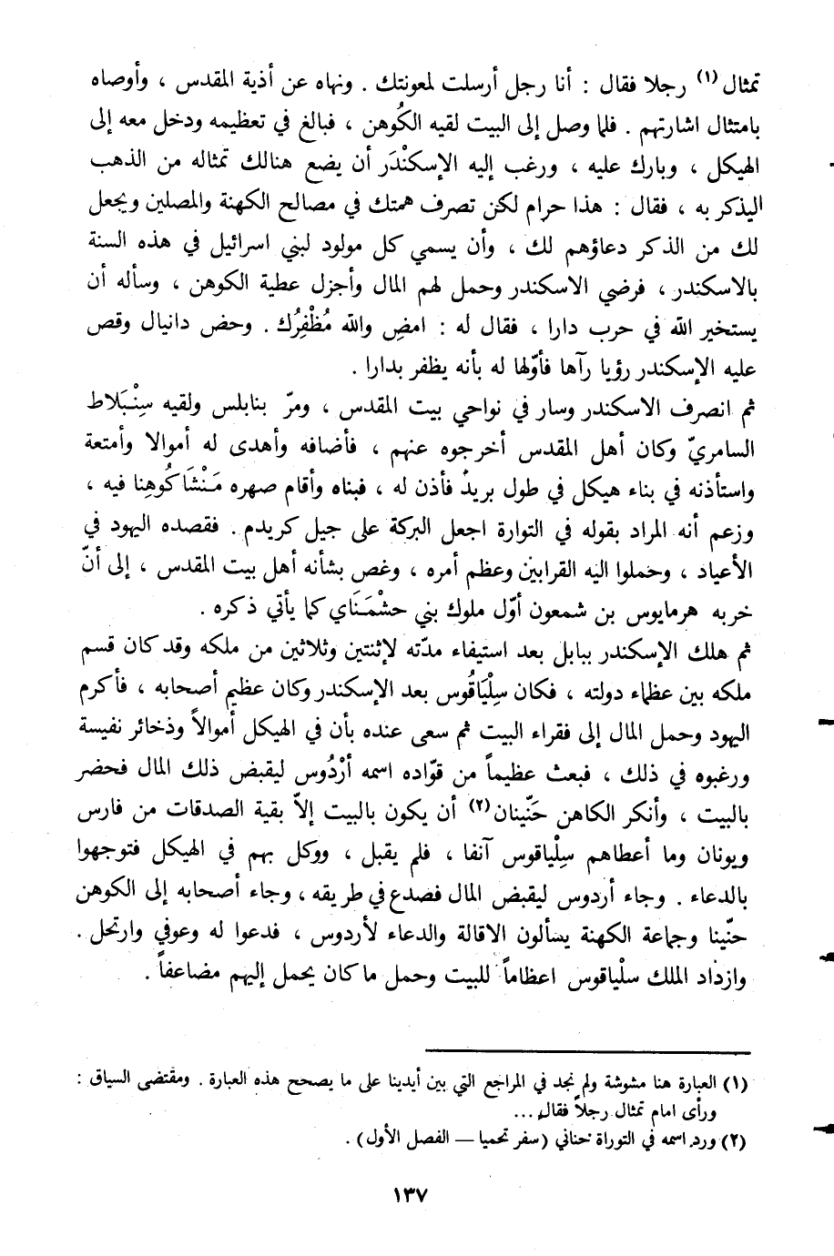 تمثال [1] رجلا فقال: أنا رجل أرسلت لمعونتك. ونهاه عن أذية المقدس، وأوصاه بامتثال اشارتهم. فلما وصل إلى البيت لقيه الكوهن، فبالغ في تعظيمه ودخل معه إلى الهيكل، وبارك عليه، ورغب إليه الإسكندر أن يضع هنالك تمثاله من الذهب اليذكر به، فقال: هذا حرام لكن تصرف همتك في مصالح الكهنة والمصلين ويجعل لك من الذكر دعاؤهم لك، وأن يسمي كل مولود لبني إسرائيل في هذه السنة بالإسكندر، فرضي الإسكندر وحمل لهم المال وأجزل عطية الكوهن، وسأله أن يستخير الله في حرب دارا، فقال له: امض والله مظفرك. وحض دانيال وقص عليه الإسكندر رؤيا رآها فأوّلها له بأنه يظفر بدارا.