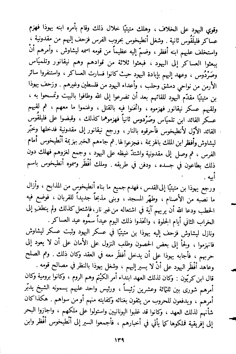 وقوي اليهود على الخلاف، وهلك متيتيّا خلال ذلك وقام بأمره ابنه يهوذا فهزم عساكر فليلقوس ثانية. وشغل أنطيخوس بحروب الفرس فزحف إليهم من مقدونية، واستخلف عليهم ابنه أفظر، وضمّ إليه عظيما من قومه اسمه ليشاوش، وأمرهم أن يبعثوا العساكر إلى اليهود، فبعثوا ثلاثة من قوادهم وهم نيقانور وتلمياس وصردوس، وعهد إليهم بإبادة اليهود حيث كانوا فسارت العساكر، واستنفروا سائر الأرمن من نواحي دمشق وحلب، وأعداء اليهود من فلسطين وغيرهم. وزحف يهوذا بن متيتيّا مقدّم اليهود للقائم بعد أن تضرعوا إلى الله وطافوا بالبيت وتمسحوا به، ولقيهم عسكر نيقانور فهزموه، واثخنوا فيه بالقتل، وغنموا ما معهم، ثم لقيهم عسكر القائد ابن تلمياس وصردوس ثانيا فهزموهما كذلك، وقبضوا على فليلقوس القائد الأوّل لأنطيخوس فأحرقوه بالنار، ورجع نيقانور إلى مقدونية فدخلها وخبّر ليشاوش وأفظر ابن الملك بالهزيمة، فجزعوا لها. ثم جاءهم الخبر بهزيمة أنطيخوس أمام الفرس، ثم وصل إلى مقدونية واشتدّ غيظه على اليهود، وجمع لغزوهم فهلك دون ذلك بطاعون في جسده، ودفن في طريقه. وملك أفظر وسموه أنطيخوس باسم أبيه.