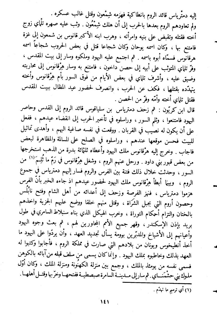 قال ابن كريّون: ثم زحف دمترياس بن سلياقوس قائد الروم إلى القدس وحاصر اليهود فامتنعوا، وثلم السور، وراسلوه في تأخير الحرب إلى انقضاء عيدهم، ففعل على أن يكون له نصيب في القربان. ووقعت في نفسه صاغية اليهم، وأهدى تماثيل للبيت فحسن موقعها عندهم، وراسلوه في الصلح على المسالمة والمظاهرة لبعض فأجاب. وخرج إليه هرقانوس ملك اليهود وأعطاه ثلاثمائة بدرة من الذهب استخرجها من بعض قبور بني داود. ورحل عنهم الروم، وشغل هرقانوس في رمّ ما ثلم [1] من السور، وحدثت خلال ذلك فتنة بين الفرس والروم فسار إليهم دمترياس في جموع الروم، وبينما أبطأ هرقانوس ملك اليهود لحضور عيدهم إذ جاءه الخبر بأنّ الفرس هزموا دمترياس، فنهز الفرصة وزحف إلى أعدائه من أهل الشام وفتح نابلس وحصون أروم التي بجبل الشراة، وقتل منهم خلقا ووضع عليهم الجزية وأخذهم بالختان والتزام أحكام التوراة، وخرب الهيكل الّذي بناه سنبلاط السامري في طول بريد بإذن الإسكندر، وقهر جميع الأمم المجاورين لهم، ثم بعث وجوه اليهود وأعيانهم إلى الأشياخ والمدبّرين برومة يسأل تجديد العهد، وأن يردّوا على اليهود ما أخذ أنطيخوس ويونان من بلادهم التي صارت في مملكة الروم، فأجابوا وكتبوا له العهد بذلك وخاطبوه بملك اليهود. وإنما كان يسمى من سلف قبله من آبائه بالكوهن فسمى نفسه من يومئذ بالملك، وجمع بين منزلة الكهنونة ومنزلة الملك، وكان أوّل ملوك بني حشمناي. ثم سار إلى مدينة السامرة صبصطية ففتحها وخرّبها وقتل أهلها.