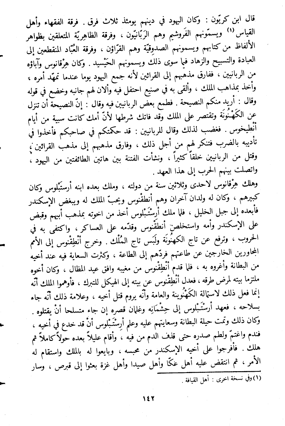 قال ابن كريّون: وكان اليهود في دينهم يومئذ ثلاث فرق. فرقة الفقهاء وأهل القياس [1] ويسمّونهم الفروشيم وهم الربّانيّون، وفرقة الظاهريّة المتعلقين بظواهر الألفاظ من كتابهم ويسمونهم الصدوقيّة وهم القرّاءون، وفرقة العبّاد المنقطعين إلى العبادة والتسبيح والزهاد فيما سوى ذلك ويسمونهم الحيسيد. وكان هرقانوس وآباؤه من الربانيين، ففارق مذهبهم إلى القراءين لأنه جمع اليهود يوما عند ما تمهّد أمره، وأخذ بمذاهب الملك، وألقى به في صنيع احتفل فيه وألان لهم جانبه وخضع في قوله وقال:، أريد منكم النصيحة. فطمع بعض الربانيين فيه وقال: إنّ النصيحة أن تنزل عن الكهنونة وتقتصر على الملك وقد فاتك شرطها لأنّ أمك كانت سبية من أيام أنطيخوس. فغضب لذلك وقال للربانيين: قد حكمتكم في صاحبكم فأخذوا في تأديبه بالضرب فتنكر لهم من أجل ذلك، وفارق مذهبهم إلى مذهب القراءين، وقتل من الربانيين خلقا كثيرا، ونشأت الفتنة بين هاتين الطائفتين من اليهود، واتصلت بينهم الحرب إلى هذا العهد.