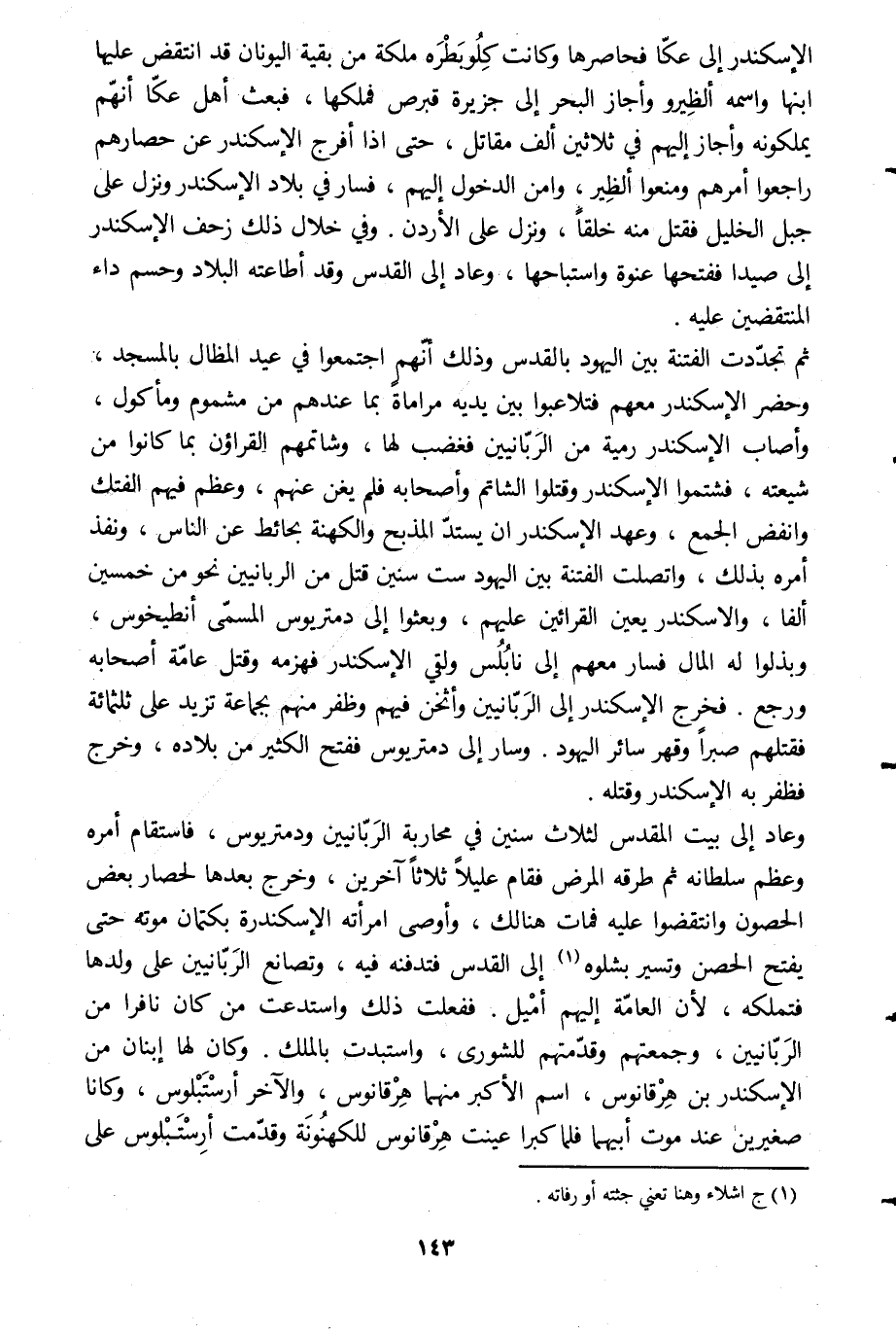 وعاد إلى بيت المقدس لثلاث سنين في محاربة الربّانيين ودمتريوس، فاستقام أمره وعظم سلطانه ثم طرقه المرض فقام عليلا ثلاثا آخرين، وخرج بعدها لحصار بعض الحصون وانتقضوا عليه فمات هنالك، وأوصى امرأته الإسكندرة بكتمان موته حتى يفتح الحصن وتسير بشلوه [1] إلى القدس فتدفنه فيه، وتصانع الربّانيين على ولدها فتملكه، لأن العامّة إليهم أميل. ففعلت ذلك واستدعت من كان نافرا من الربّانيين، وجمعتهم وقدّمتهم للشورى، واستبدت بالملك. وكان لها ابنان من الإسكندر بن هرقانوس، اسم الأكبر منهما هرقانوس، والآخر أرستبلوس، وكانا صغيرين عند موت أبيهما فلما كبرا عينت هرقانوس للكهنونة وقدّمت أرستبلوس على