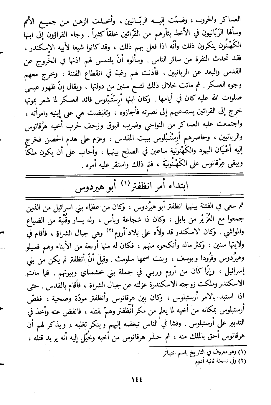 العساكر والحروب، وضمّت إليه الربّانيين، وأخذت الرهن من جميع الأمم وسألها الربّانيون في الأخذ بثأرهم من القرّاءين خلقا كثيرا. وجاء القراءون إلى ابنها الكهنون ينكرون ذلك وأنّه إذا فعل بهم ذلك، وقد كانوا شيعا لأبيه الإسكندر، فقد تحدث النفرة من سائر الناس. وسألوه أن يلتمس لهم اذنها في الخروج عن القدس والبعد عن الربانيين، فأذنت لهم رغبة في انقطاع الفتنة، وخرج معهم وجوه العسكر. ثم ماتت خلال ذلك لتسع سنين من دولتها، ويقال إنّ ظهور عيسى صلوات الله عليه كان في أيامها. وكان ابنها أرستبلوس قائد العسكر لما شعر بموتها خرج إلى القراءين يستدعيهم إلى نصرته فأجازوه، وتقبضت هي على ابنيه وامرأته، واجتمعت عليه العساكر من النواحي وضرب البوق وزحف لحرب أخيه هرقانوس والربانيين، وحاصرهم أرستبلوس ببيت المقدس، وعزم على هدم الحصن فخرج إليه أعيان اليهود والكهنونية ساعين في الصلح بينهما، وأجاب على أن يكون ملكا ويبقى هرقانوس على الكهنونيّة، فتم ذلك واستقر عليه أمره.