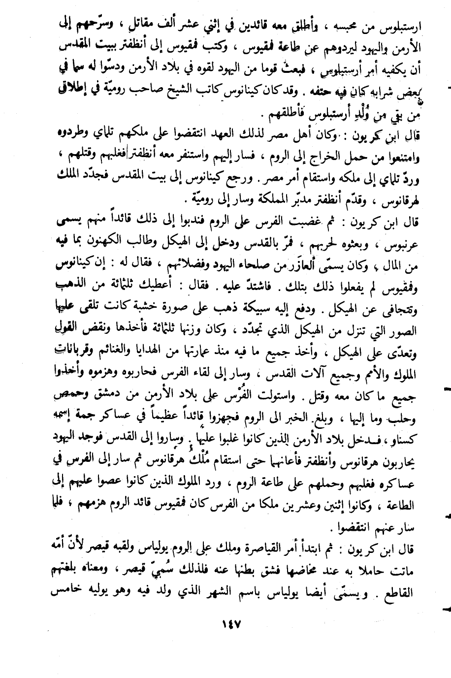 قال ابن كريون: ثم غضبت الفرس على الروم فندبوا إلى ذلك قائدا منهم يسمى عرنبوس، وبعثوه لحربهم، فمرّ بالقدس ودخل إلى الهيكل وطالب الكهنون بما فيه من المال، وكان يسمّى ألعازر من صلحاء اليهود وفضلائهم، فقال له: إن كينانوس وفمقيوس لم يفعلوا ذلك بتلك. فاشتدّ عليه. فقال: أعطيك ثلاثمائة من الذهب وتتجافى عن الهيكل. ودفع إليه سبيكة ذهب على صورة خشبة كانت تلقى عليها الصور التي تنزل من الهيكل الّذي تجدّد، وكان وزنها ثلاثمائة فأخذها ونقض القول وتعدّ على الهيكل، وأخذ جميع ما فيه منذ عمارتها من الهدايا والغنائم وقربانات الملوك والأمم وجميع آلات القدس، وسار إلى لقاء الفرس فحاربوه وهزموه وأخذوا جميع ما كان معه وقتل. واستولت الفرس على بلاد الأرمن من دمشق وحمص وحلب وما إليها، وبلغ الخبر الى الروم فجهزوا قائدا عظيما في عساكر جمة اسمه كسنا و، فدخل بلاد الأرمن الذين كانوا غلبوا عليها. وساروا إلى القدس فوجد اليهود يحاربون هرقانوس وأنظفتر فأعانهما حتى استقام ملك هرقانوس ثم سار إلى الفرس في عساكره فغلبهم وحملهم على طاعة الروم، ورد الملوك الذين كانوا عصوا عليهم إلى الطاعة، وكانوا اثنين وعشرين ملكا من الفرس كان فمقيوس قائد الروم هزمهم، فلما سار عنهم انتقضوا.
