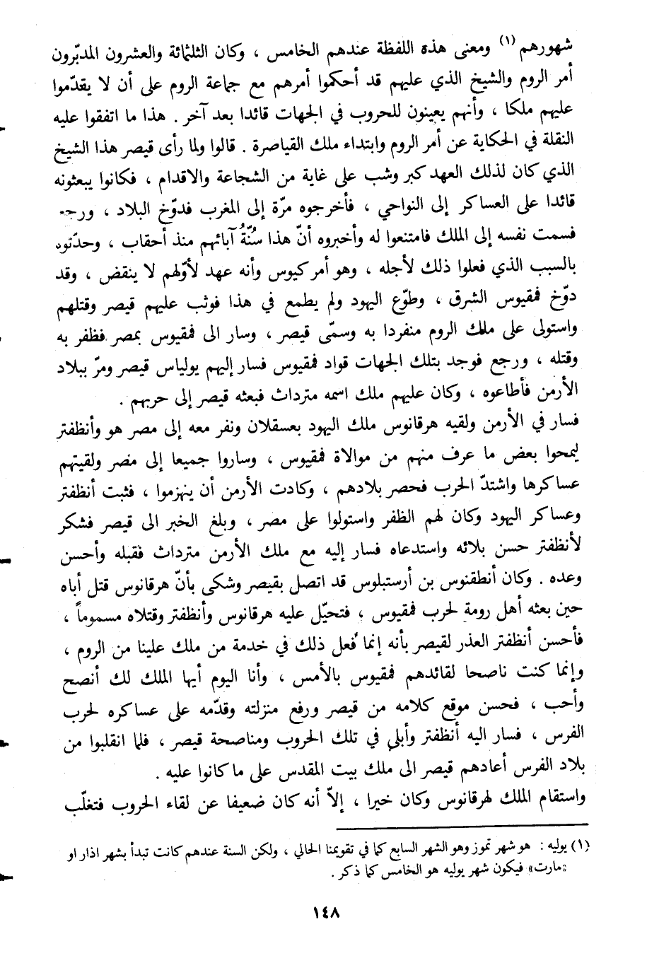 شهورهم [1] ومعنى هذه اللفظة عندهم الخامس، وكان الثلاثمائة والعشرون المدبّرون أمر الروم والشيخ الّذي عليهم قد أحكموا أمرهم مع جماعة الروم على أن لا يقدّموا عليهم ملكا، وأنهم يعينون للحروب في الجهات قائدا بعد آخر. هذا ما اتفقوا عليه النقلة في الحكاية عن أمر الروم وابتداء ملك القياصرة. قالوا ولما رأى قيصر هذا الشيخ الّذي كان لذلك العهد كبر وشب على غاية من الشجاعة والاقدام، فكانوا يبعثونه قائدا على العساكر إلى النواحي، فأخرجوه مرّة إلى المغرب فدوّخ البلاد، ورجع فسمت نفسه إلى الملك فامتنعوا له وأخبروه أنّ هذا سنّة آبائهم منذ أحقاب، وحدّثوه بالسبب الّذي فعلوا ذلك لأجله، وهو أمر كيوس وأنه عهد لأوّلهم لا ينقض، وقد دوّخ فمقيوس الشرق، وطوّع اليهود ولم يطمع في هذا فوثب عليهم قيصر وقتلهم واستولى على ملك الروم منفردا به وسمّى قيصر، وسار الى فمقيوس بمصر فظفر به وقتله، ورجع فوجد بتلك الجهات قواد فمقيوس فسار إليهم يولياس قيصر ومرّ ببلاد الأرمن فأطاعوه، وكان عليهم ملك اسمه مترداث فبعثه قيصر إلى حربهم.