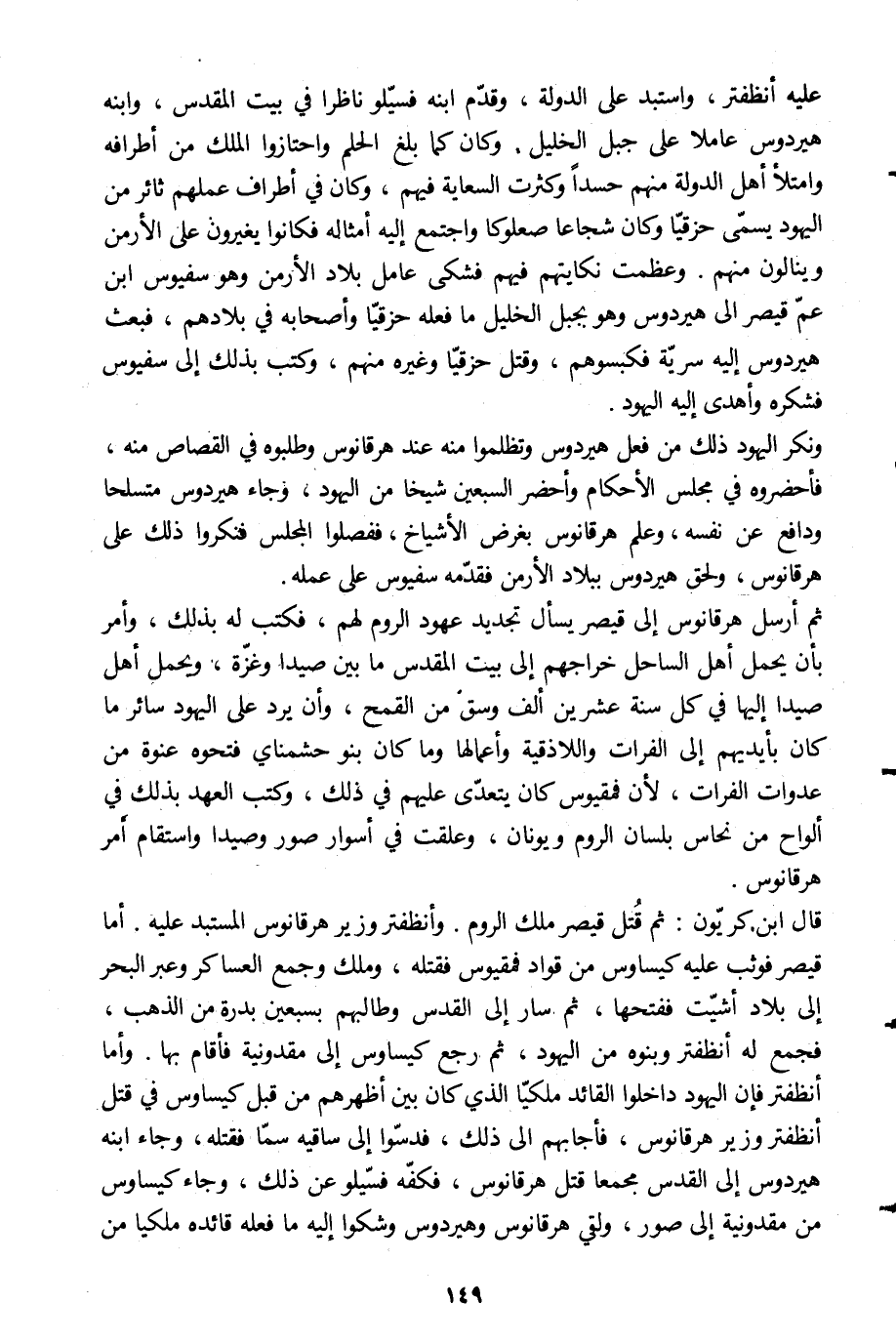 عليه أنظفتر، واستبد على الدولة، وقدّم ابنه فسيّلو ناظرا في بيت المقدس، وابنه هيردوس عاملا على جبل الخليل، وكان كما بلغ الحلم واحتازوا الملك من أطرافه وامتلأ أهل الدولة منهم حسدا وكثرت السعاية فيهم، وكان في أطراف عملهم ثائر من اليهود يسمّى حزقيّا وكان شجاعا صعلوكا واجتمع إليه أمثاله فكانوا يغيرون على الأرمن وينالون منهم. وعظمت نكايتهم فيهم فشكى عامل بلاد الأرمن وهو سفيوس ابن عمّ قيصر الى هيردوس وهو بجبل الخليل ما فعله حزقيّا وأصحابه في بلادهم، فبعث هيردوس إليه سريّة فكبسوهم، وقتل حزقيّا وغيره منهم، وكتب بذلك إلى سفيوس فشكره وأهدى إليه اليهود.