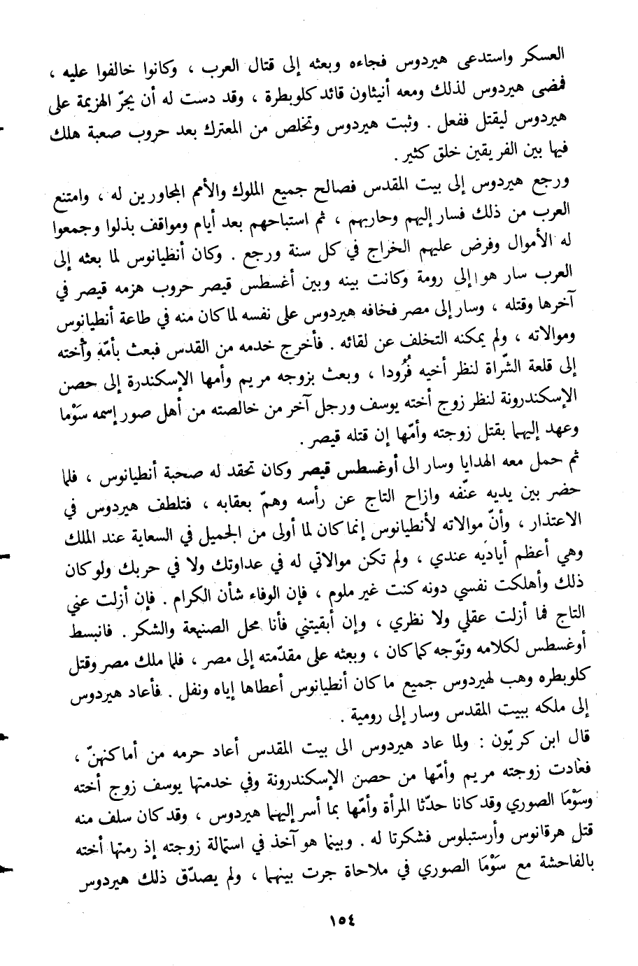العسكر واستدعى هيردوس فجاءه وبعثه إلى قتال العرب، وكانوا خالفوا عليه، فمضى هيردوس لذلك ومعه أنيثاون قائد كلوبطرة، وقد دست له أن يجرّ الهزيمة على هيردوس ليقتل ففعل. وثبت هيردوس وتخلص من المعترك بعد حروب صعبة هلك فيها بين الفريقين خلق كثير.