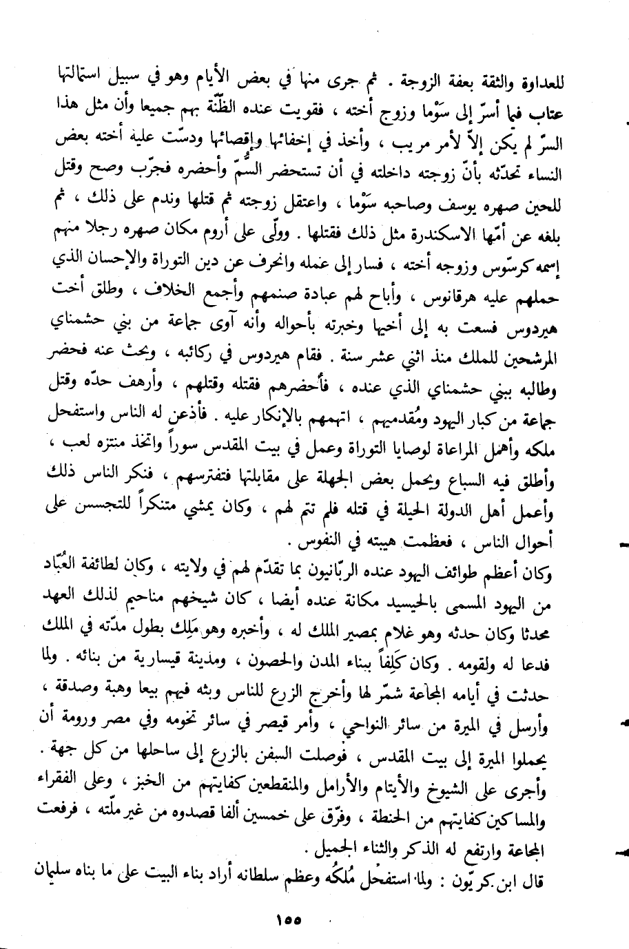 للعداوة والثقة بعفة الزوجة. ثم جرى منها في بعض الأيام وهو في سبيل استمالتها عتاب فيما أسرّ إلى سوما وزوج أخته، فقويت عنده الظّنّة بهم جميعا وأن مثل هذا السرّ لم يكن إلّا لأمر مريب، وأخذ في إخفائها وإقصائها ودسّت عليه أخته بعض النساء تحدّثه بأنّ زوجته داخلته في أن تستحضر السّمّ وأحضره فجرّب وصح وقتل للحين صهره يوسف وصاحبه سوما، واعتقل زوجته ثم قتلها وندم على ذلك، ثم بلغه عن أمّها الاسكندرة مثل ذلك فقتلها. وولّى على أروم مكان صهره رجلا منهم اسمه كرسّوس وزوجته أخته، فسار إلى عمله وانحرف عن دين التوراة والإحسان الّذي حملهم عليه هرقانوس، وأباح لهم عبادة صنمهم وأجمع الخلاف، وطلق أخت هيردوس فسعت به إلى أخيها وخبرته بأحواله وأنه آوى جماعة من بني حشمناي المرشحين للملك منذ اثني عشر سنة. فقام هيردوس في ركائبه، وبحث عنه فحضر وطالبه ببني حشمناي الّذي عنده، فأحضرهم فقتله وقتلهم، وأرهف حدّه وقتل جماعة من كبار اليهود ومقدميهم، أتمهم بالإنكار عليه. فأذعن له الناس واستفحل ملكه وأهمل المراعاة لوصايا التوراة وعمل في بيت المقدس سورا واتخذ منتزه لعب، وأطلق فيه السباع ويحمل بعض الجهلة على مقابلتها فتفترسهم، فنكر الناس ذلك وأعمل أهل الدولة الحيلة في قتله فلم تتم لهم، وكان يمشي متنكرا للتجسس على أحوال الناس، فعظمت هيبته في النفوس.