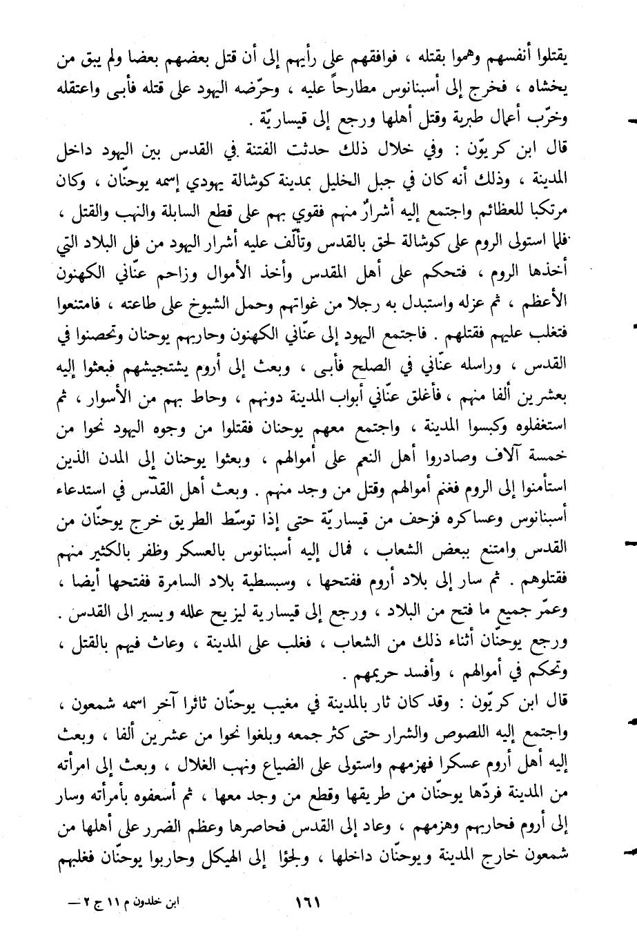 قال ابن كريّون: وفي خلال ذلك حدثت الفتنة في القدس بين اليهود داخل المدينة، وذلك أنه كان في جبل الخليل بمدينة كوشالة يهودي اسمه يوحنّان، وكان مرتكبا للعظائم واجتمع إليه أشرار منهم فقوي بهم على قطع السابلة والنهب والقتل، فلما استولى الروم على كوشالة لحق بالقدس وتألّف عليه أشرار اليهود من فل البلاد التي أخذها الروم، فتحكم على أهل المقدس وأخذ الأموال وزاحم عنّاني الكهنون الأعظم، ثم عزله واستبدل به رجلا من غواتهم وحمل الشيوخ على طاعته، فامتنعوا فتغلب عليهم فقتلهم. فاجتمع اليهود إلى عنّاني الكهنون وحاربهم يوحنان وتحصنوا في القدس، وراسله عنّاني في الصلح فأبى، وبعث إلى أروم يشتجيشهم فبعثوا إليه بعشرين ألفا منهم، فأغلق عنّاني أبواب المدينة دونهم، وحاط بهم من الأسوار، ثم استغفلوه وكبسوا المدينة، واجتمع معهم يوحنان فقتلوا من وجوه اليهود نحوا من خمسة آلاف وصادروا أهل النعم على أموالهم، وبعثوا يوحنان إلى المدن الذين استأمنوا إلى الروم فغنم أموالهم وقتل من وجد منهم. وبعث أهل القدس في استدعاء أسبنانوس وعساكره فزحف من قيساريّة حتى إذا توسّط الطريق خرج يوحنّان من القدس وامتنع ببعض الشعاب، فمال إليه أسبنانوس بالعسكر وظفر بالكثير منهم فقتلوهم. ثم سار إلى بلاد أروم ففتحها، وسبسطية بلاد السامرة ففتحها أيضا، وعمّر جميع ما فتح من البلاد، ورجع إلى قيسارية ليزيح علله ويسير الى القدس.