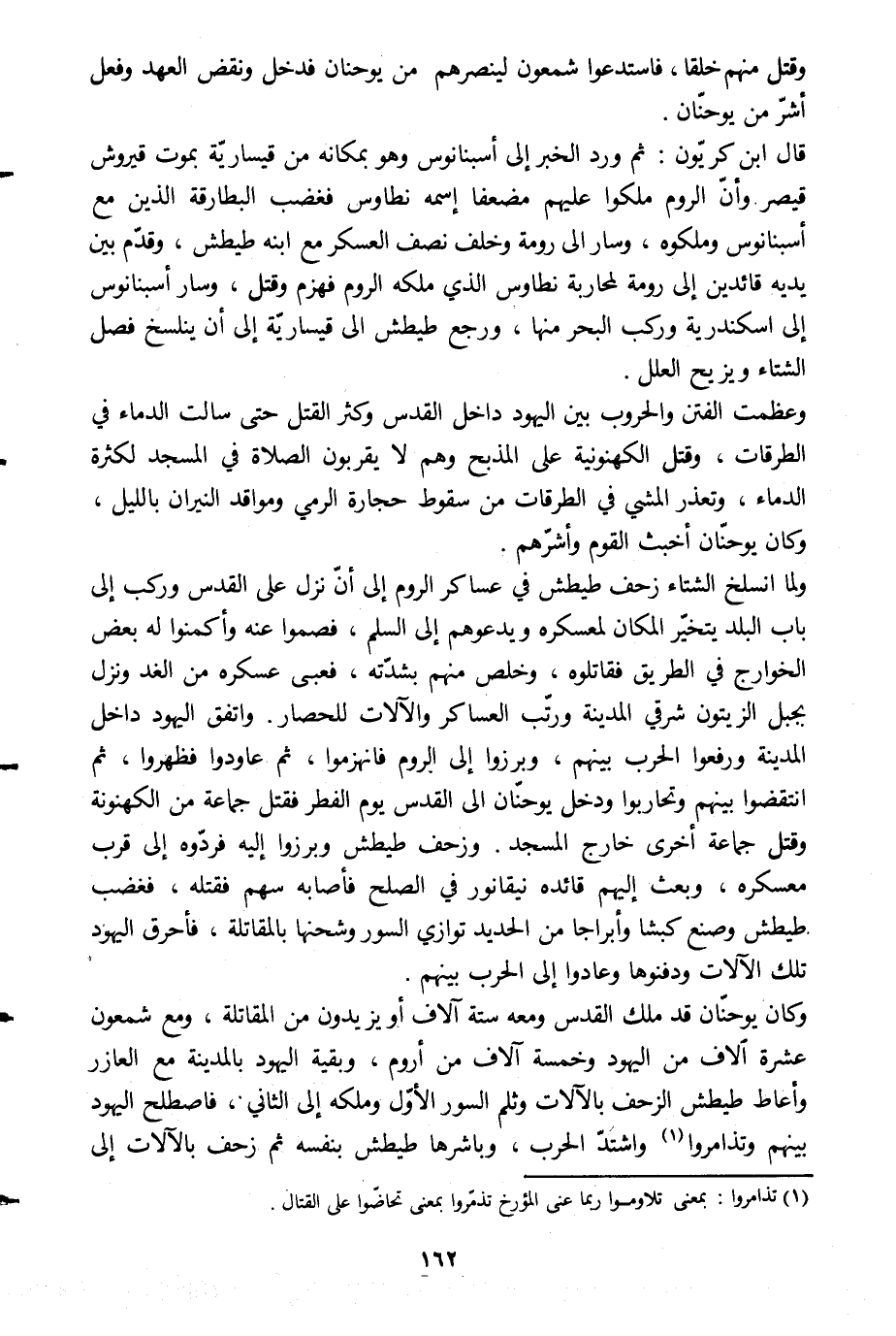 وكان يوحنّان قد ملك القدس ومعه ستة آلاف أو يزيدون من المقاتلة، ومع شمعون عشرة الاف من اليهود وخمسة آلاف من أروم، وبقية اليهود بالمدينة مع العازر وأعاط طيطش الزحف بالآلات وثلم السور الأوّل وملكه إلى الثاني، فاصطلح اليهود بينهم وتذامروا [1] واشتدّ الحرب، وباشرها طيطش بنفسه ثم زحف بالآلات إلى