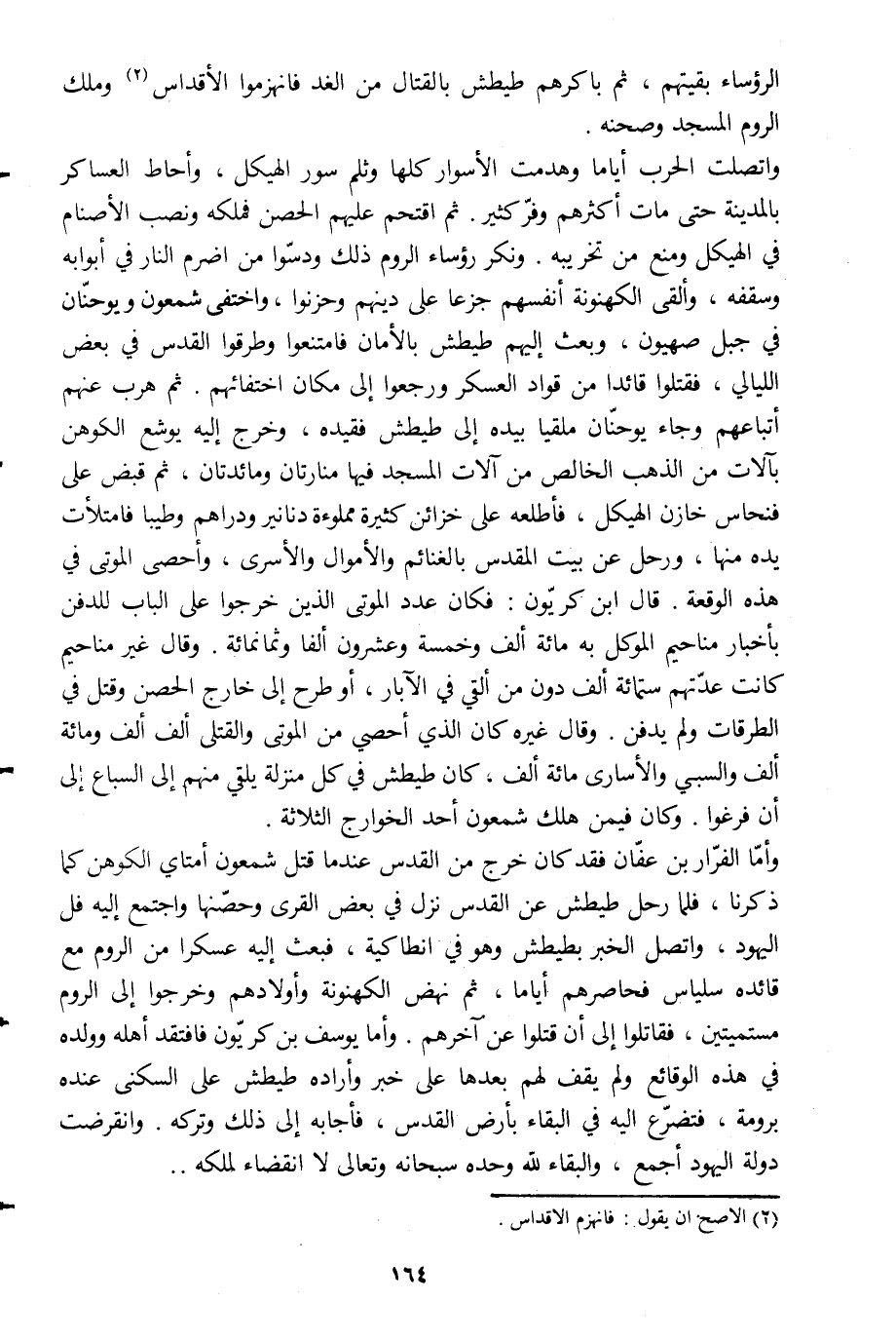 واتصلت الحرب أياما وهدمت الأسوار كلها وثلم سور الهيكل، وأحاط العساكر بالمدينة حتى مات أكثرهم وفرّ كثير. ثم اقتحم عليهم الحصن فملكه ونصب الأصنام في الهيكل ومنع من تخريبه. ونكر رؤساء الروم ذلك ودسّوا من اضرم النار في أبوابه وسقفه، وألقى الكهنونة أنفسهم جزعا على دينهم وحزنوا، واختفى شمعون ويوحنّان في جبل صهيون، وبعث إليهم طيطش بالأمان فامتنعوا وطرقوا القدس في بعض الليالي، فقتلوا قائدا من قواد العسكر ورجعوا إلى مكان اختفائهم. ثم هرب عنهم أتباعهم وجاء يوحنّان ملقيا بيده إلى طيطش فقيده، وخرج إليه يوشع الكوهن بآلات من الذهب الخالص من آلات المسجد فيها منارتان ومائدتان، ثم قبض على فنحاس خازن الهيكل، فأطلعه على خزائن كثيرة مملوءة دنانير ودراهم وطيبا فامتلأت يده منها، ورحل عن بيت المقدس بالغنائم والأموال والأسرى، وأحصى الموتى في هذه الوقعة. قال ابن كريّون: فكان عدد الموتى الذين خرجوا على الباب للدفن بأخبار مناحيم الموكل به مائة ألف وخمسة وعشرون ألفا وثمانمائة. وقال غير مناحيم كانت عدّتهم ستمائة ألف دون من ألقي في الآبار، أو طرح إلى خارج الحصن وقتل في الطرقات ولم يدفن. وقال غيره كان الّذي أحصي من الموتى والقتلى ألف ألف ومائة ألف والسبي والأسارى مائة ألف، كان طيطش في كل منزلة يلقي منهم إلى السباع إلى أن فرغوا. وكان فيمن هلك شمعون أحد الخوارج الثلاثة.