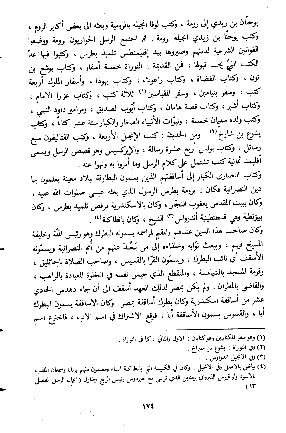 وكتاب النصارى الكبار إلى أساقفتهم الذين يسمون البطارقة ببلاد معينة يعلمون بها دين النصرانية فكان: برومة بطرس الرسول الّذي بعثه عيسى صلوات الله عليه، وكان بيت المقدس يعقوب النجّار، وكان بالإسكندرية، مرقص تلميذ بطرس، وكان ببيزنطية وهي قسطنطينية أندرواس [3] الشيخ، وكان بأنطاكية [4] .