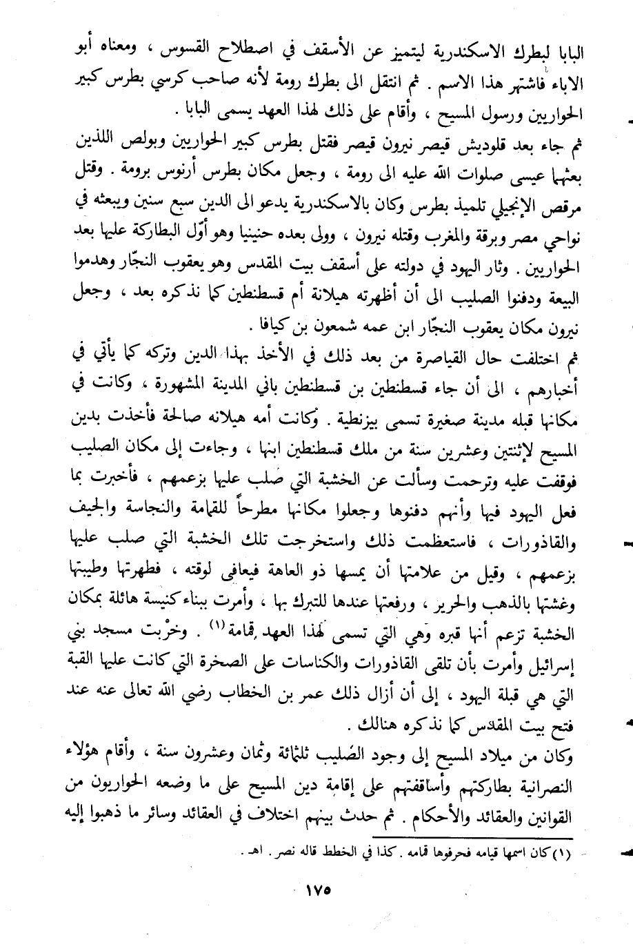 وكان من ميلاد المسيح إلى وجود الصليب ثلاثمائة وثمان وعشرون سنة، وأقام هؤلاء النصرانية بطاركتهم وأساقفتهم على إقامة دين المسيح على ما وضعه الحواريون من القوانين والعقائد والأحكام. ثم حدث بينهم اختلاف في العقائد وسائر ما ذهبوا إليه