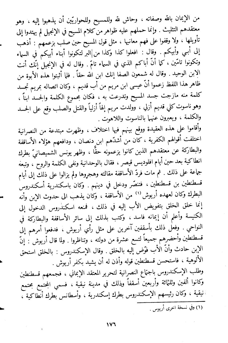وأقاموا على هذه العقيدة ووقع بينهم فيها اختلاف، وظهرت مبتدعة من النصرانية اختلفت أقوالهم الكفرية، كان من أشدّهم ابن دنصان، ودافعهم هؤلاء الأساقفة والبطاركة عن معتقدهم الذين كانوا يزعمونه حقّا، وظهر يونس الشميصانيّ بطرك انطاكية بعد حين أيام افلوديس قيصر، فقال بالوحدانية ونفى الكلمة والروح، وتبعه جماعة على ذلك. ثم مات فردّ الأساقفة مقالته وهجروها ولم يزالوا على ذلك إلى أيام قسطنطين بن قسطنطين، فتنصّر ودخل في دينهم. وكان باسكندرية أسكندروس البطرك وكان لعهده أريوش [1] من الأساقفة، وكان يذهب الى حدوث الابن وأنه إنما خلق الخلق بتفويض الأب إليه في ذلك، فمنعه إسكندروس الدخول إلى الكنيسة وأعلم أن إيمانه فاسد، وكتب بذلك إلى سائر الأساقفة والبطاركة في النواحي. وفعل ذلك بأسقفين آخرين على مثل رأي أريوش، فدفعوا أمرهم إلى قسطنطين وأحضرهم جميعا لتسع عشرة من دولته، وتناظروا. ولما قال أريوش: إنّ الابن حادث وأنّ الأب فوّض إليه بالخلق. وقال الإسكندروس: بالخلق استحق الألوهية، فاستحسن قسطنطين قوله وأذن له أن يشيد بكفر أريوش.