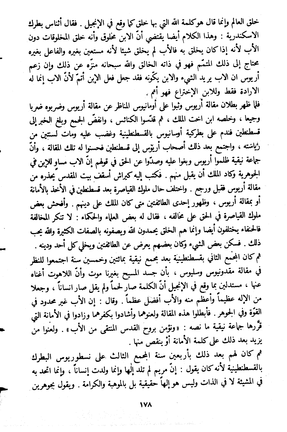خلق العالم وإنما قال هو كلمة الله التي بها خلق كما وقع في الإنجيل. فقال أثناس بطرك الاسكندرية: وهذا الكلام أيضا يقتضي أنّ الابن مخلوق وأنه خلق المخلوقات دون الأب لأنه إذا كان يخلق به فالأب لم يخلق شيئا لأنه مستعين بغيره والفاعل بغيره محتاج إلى ذلك المتمّم فهو في ذاته الخالق والله سبحانه منزّه عن ذلك وإن زعم أريوس ان الأب يريد الشيء والابن يكونه فقد جعل فعل الابن أتمّ لأنّ الأب إنما له الارادة فقط وللابن الاختراع فهو أتم.