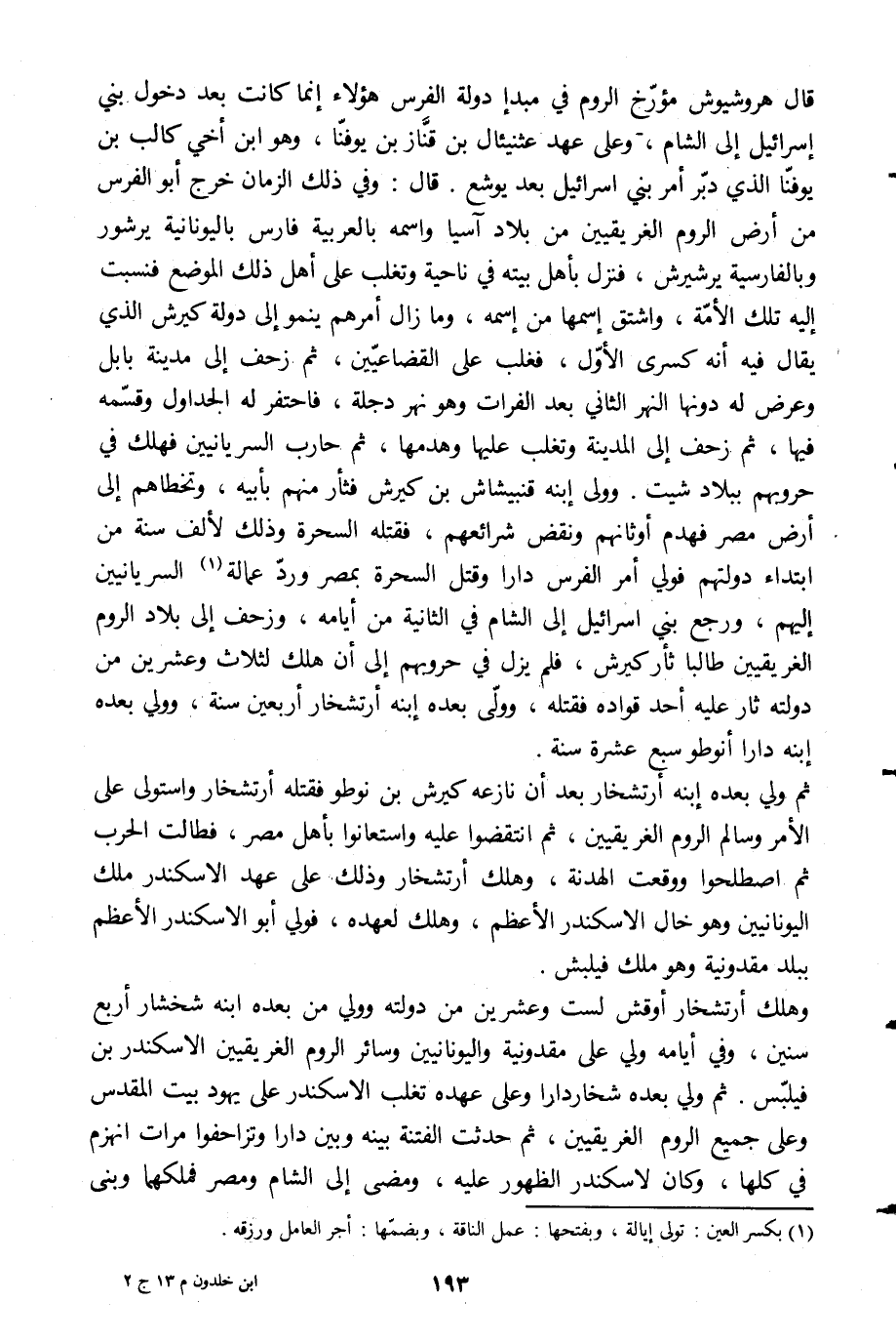 قال هروشيوش مؤرّخ الروم في مبدإ دولة الفرس هؤلاء إنما كانت بعد دخول بني إسرائيل إلى الشام، وعلى عهد عثنيئال بن قنّاز بن يوفّنا، وهو ابن أخي كالب بن يوفنّا الّذي دبّر أمر بني إسرائيل بعد يوشع. قال: وفي ذلك الزمان خرج أبو الفرس من أرض الروم الغريقيين من بلاد آسيا واسمه بالعربية فارس باليونانية يرشور وبالفارسية يرشيرش، فنزل بأهل بيته في ناحية وتغلب على أهل ذلك الموضع فنسبت إليه تلك الأمّة، واشتق اسمها من اسمه، وما زال أمرهم ينمو إلى دولة كيرش الّذي يقال فيه أنه كسرى الأوّل، فغلب على القضاعيّين، ثم زحف إلى مدينة بابل وعرض له دونها النهر الثاني بعد الفرات وهو نهر دجلة، فاحتفر له الجداول وقسّمه فيها، ثم زحف إلى المدينة وتغلب عليها وهدمها، ثم حارب السريانيين فهلك في حروبهم ببلاد شيت. وولى ابنه قنبيشاش بن كيرش فثأر منهم بأبيه، وتخطاهم إلى أرض مصر فهدم أوثانهم ونقض شرائعهم، فقتله السحرة وذلك لألف سنة من ابتداء دولتهم فولي أمر الفرس دارا وقتل السحرة بمصر وردّ عمالة [1] السريانيين إليهم، ورجع بني إسرائيل إلى الشام في الثانية من أيامه، وزحف إلى بلاد الروم الغريقيين طالبا ثأر كيرش، فلم يزل في حروبهم إلى أن هلك لثلاث وعشرين من دولته نار عليه أحد قواده فقتله، وولّى بعده ابنه أرتشخار أربعين سنة، وولي بعده ابنه دارا أنوطو سبع عشرة سنة.