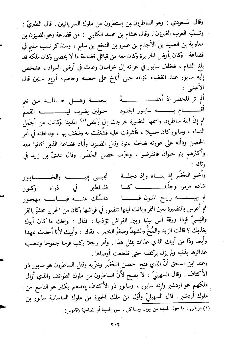 ثم إنّ ابنة ساطرون واسمها النضيرة خرجت إلى ربض [1] المدينة وكانت من أجمل النساء، وسابور كان جميلا، فأشرفت عليه فشغفت به شغف بها، وداخلته في أمر الحصن ودلّته على عورته فدخله عنوة وقتل الضيزن وأباد قضاعة الذين كانوا معه وأكثرهم بنو حلوان فانقرضوا، وخرّب حصن الحضر. وقال عديّ بن زيد في رثائه: