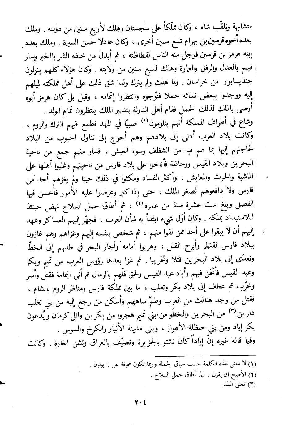 متشابهة وتلقّب شاه، وكان مملّكا على سجستان وهلك لأربع سنين من دولته. وملك بعده أخوه قرسين بن بهرام تسع سنين أخرى، وكان عادلا حسن السيرة. وملك بعده ابنه هرمز بن قرسين فوجل منه الناس لفظاظته، ثم أبدل من خلقه الشر بالخير وسار فيهم بالعدل والرّفق والعمارة وهلك لسبع سنين من ولايته. وكان هؤلاء كلهم ينزلون جنديسابور من خراسان. ولما هلك ولم يترك ولدا شق ذلك على أهل مملكته لميلهم إليه ووجدوا ببعض نسائه حملا فتوّجوه وانتظروا إتمامه، وقيل بل كان هرمز أبوه أوصى بالملك لذلك الحمل فقام أهل الدولة بتدبير الملك ينتظرون تمام الولد.