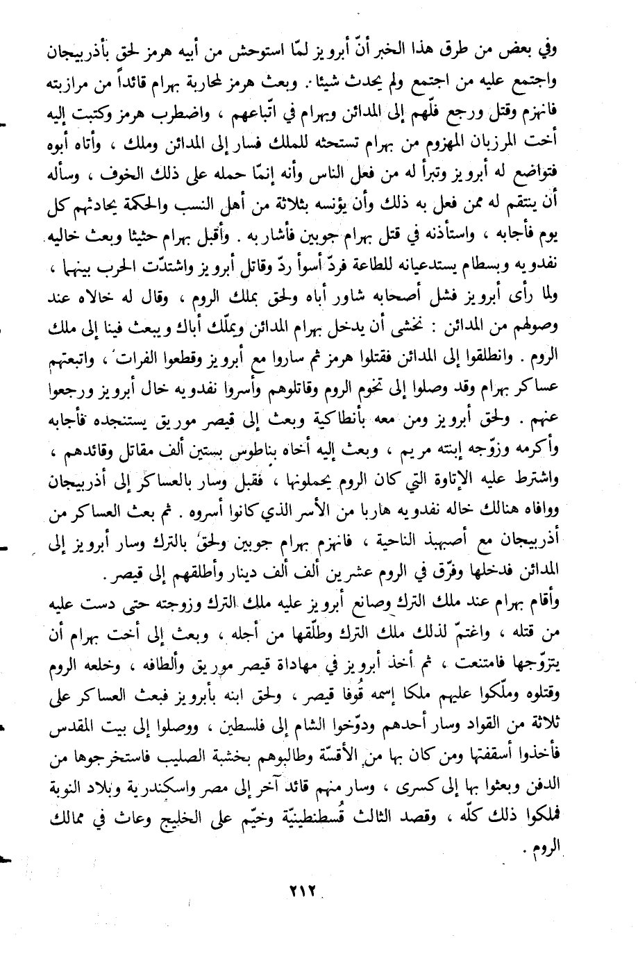 وأقام بهرام عند ملك الترك وصانع أبرويز عليه ملك الترك وزوجته حتى دست عليه من قتله، واغتمّ لذلك ملك الترك وطلّقها من أجله، وبعث إلى أخت بهرام أن يتزوّجها فامتنعت، ثم أخذ أبرويز في مهاداة قيصر موريق وألطافه، وخلعه الروم وقتلوه وملّكوا عليهم ملكا اسمه قوفا قيصر، ولحق ابنه بأبرويز فبعث العساكر على ثلاثة من القواد وسار أحدهم ودوّخوا الشام إلى فلسطين، ووصلوا إلى بيت المقدس فأخذوا أسقفتها ومن كان بها من الأقسّة وطالبوهم بخشبة الصليب فاستخرجوها من الدفن وبعثوا بها إلى كسرى، وسار منهم قائد آخر إلى مصر واسكندرية وبلاد النوبة فملكوا ذلك كلّه، وقصد الثالث قسطنطينيّة وخيّم على الخليج وعاث في ممالك الروم.