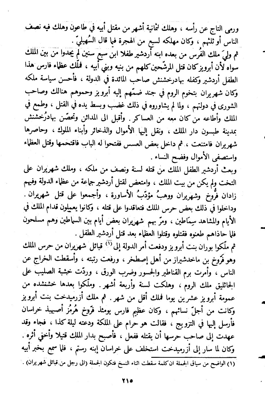 ثم ملّكوا بوران بنت أبرويز ودفعت أمير الدولة إلى [1] قبائل شهريران من حرس الملك وهو فرّوخ بن ماخد شيراز من أهل إصطخر، ورفعت رتبته، وأسقطت الخراج عن الناس، وأمرت برم القناطير والجسور وضرب الورق، وردّت خشبة الصليب على الجاثليق ملك الروم، وهلكت لسنة وأربعة أشهر. وملّكوا بعدها خشنشده من عمومة أبرويز عشرين يوما فملك أقل من شهر. ثم ملك أزرميدخت بنت أبرويز وكانت من أجلّ نسائهم، وكان عظيم فارس يومئذ فرّوخ هرمز أصبهبذ خراسان فأرسل إليها في التزويج، فقالت هو حرام على الملكة ودعته ليلة كذا، فجاء وقد عهدت إلى صاحب حرسها أن يقتله ففعل، فأصبح بدار الملك قتيلا وأخفي أثره.