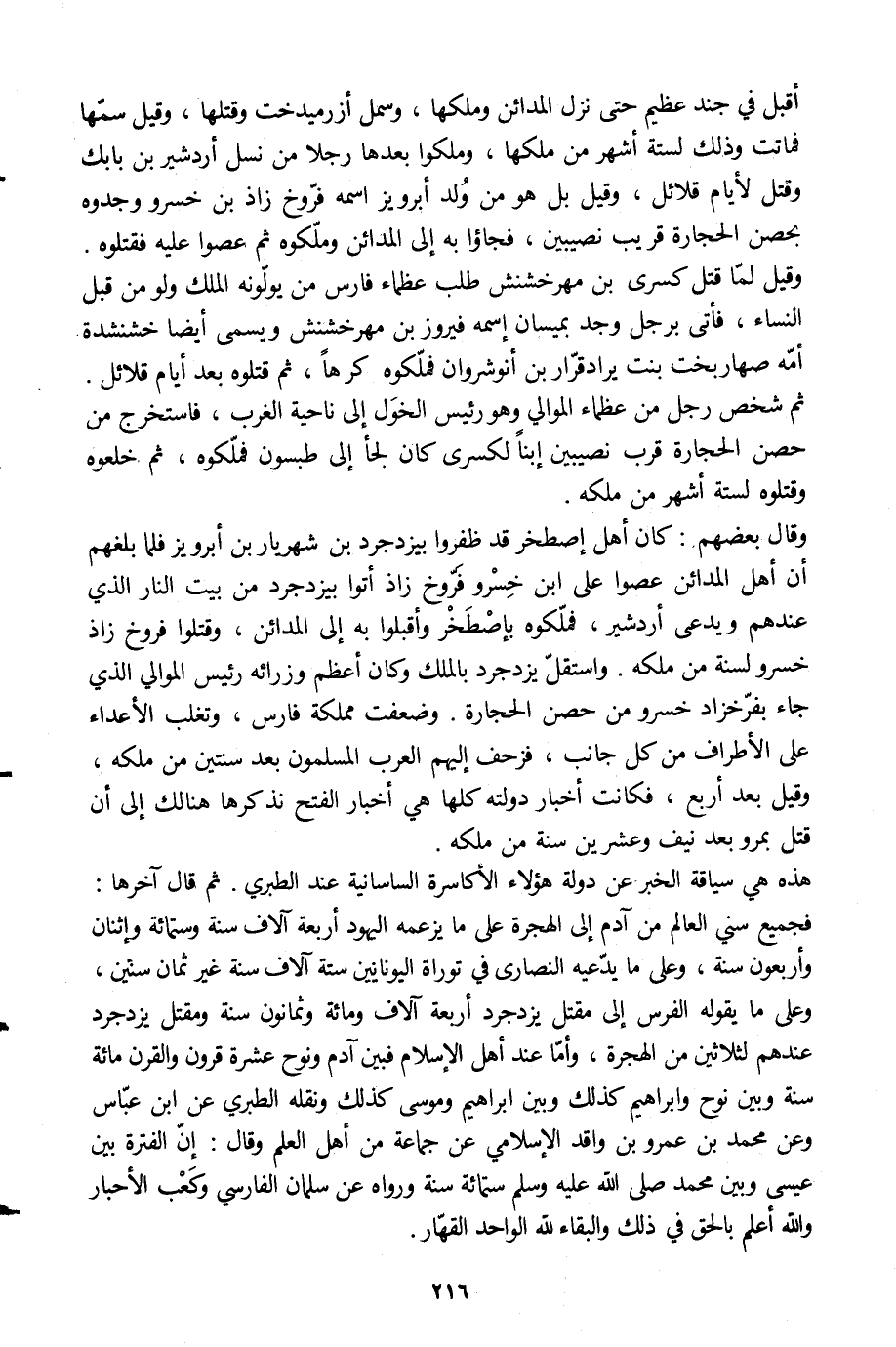 هذه هي سياقة الخبر عن دولة هؤلاء الأكاسرة الساسانية عند الطبري. ثم قال آخرها: