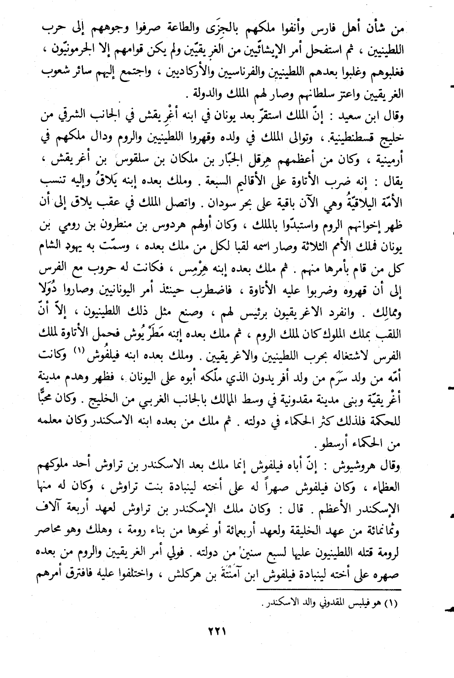 وقال ابن سعيد: إنّ الملك استقرّ بعد يونان في ابنه أغريقش في الجانب الشرقي من خليج قسطنطينية، وتوالى الملك في ولده وقهروا اللطينيين والروم ودال ملكهم في أرمينية، وكان من أعظمهم هرقل الجبّار بن ملكان بن سلقوس بن أغريقش، يقال: إنه ضرب الإتاوة على الأقاليم السبعة. وملك بعده ابنه يلاق وإليه تنسب الأمّة اليلاقيّة وهي الآن باقية على بحر سودان. واتصل الملك في عقب يلاق إلى أن ظهر إخوانهم الروم واستبدّوا بالملك، وكان أولهم هردوس بن منطرون بن رومي بن يونان فملك الأمم الثلاثة وصار اسمه لقبا لكل من ملك بعده، وسمّت به يهود الشام كل من قام بأمرها منهم. ثم ملك بعده ابنه هرمس، فكانت له حروب مع الفرس إلى أن قهروه وضربوا عليه الإتاوة، فاضطرب حينئذ أمر اليونانيين وصاروا دولا وممالك. وانفرد الاغريقيون برئيس لهم، وصنع مثل ذلك اللطينيون، إلّا أنّ اللقب بملك الملوك كان لملك الروم، ثم ملك بعده ابنه مطريوش فحمل الإتاوة لملك الفرس لاشتغاله بحرب اللطينيين والإغريقيين. وملك بعده ابنه فيلفوش [1] وكانت أمّه من ولد سرم من ولد أفريدون الّذي ملّكه أبوه على اليونان، فظهر وهدم مدينة إغريقيّة وبنى مدينة مقدونية في وسط الممالك بالجانب الغربي من الخليج. وكان محبّا للحكمة فلذلك كثر الحكماء في دولته. ثم ملك من بعده ابنه الإسكندر وكان معلمه من الحكماء أرسطو.
