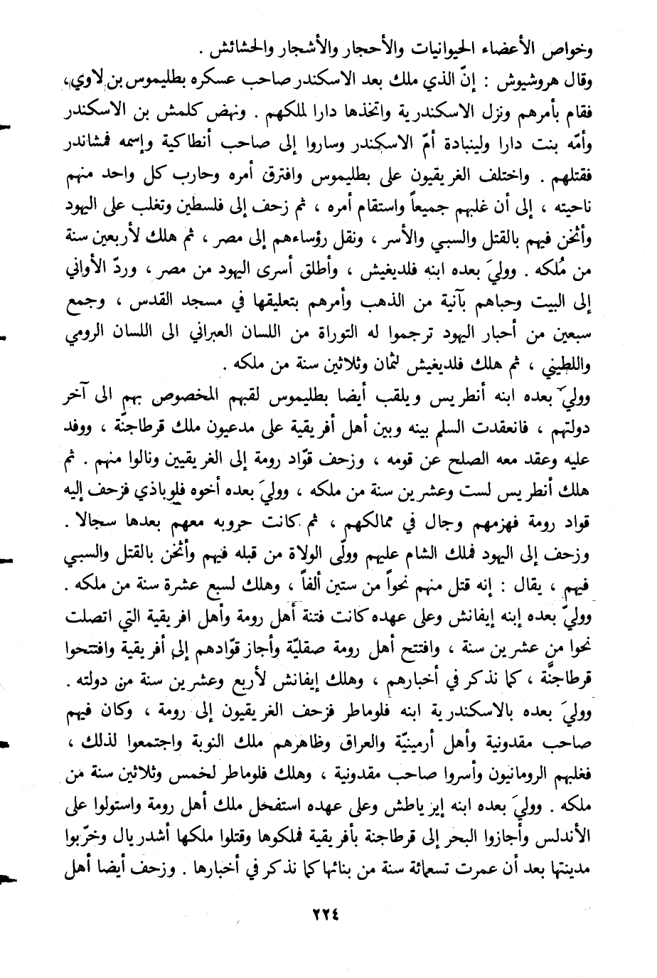 وولي بعده بالإسكندرية ابنه فلو ماطر فزحف الغريقيون إلى رومة، وكان فيهم صاحب مقدونية وأهل أرمينيّة والعراق وظاهرهم ملك النوبة واجتمعوا لذلك، فغلبهم الرومانيون وأسروا صاحب مقدونية، وهلك فلو ماطر لخمس وثلاثين سنة من ملكه. وولي بعده ابنه إيرياطش وعلى عهده استفحل ملك أهل رومة واستولوا على الأندلس وأجازوا البحر إلى قرطاجنة بإفريقية فملكوها وقتلوا ملكها أشدريال وخرّبوا مدينتها بعد أن عمرت تسعمائة سنة من بنائها كما نذكر في أخبارها. وزحف أيضا أهل