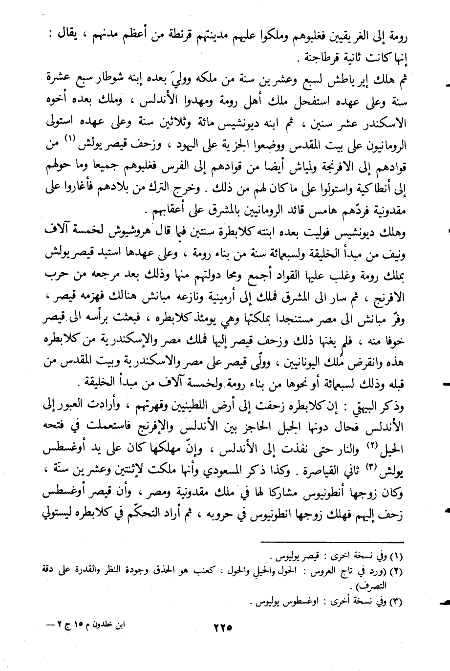 وهلك ديونشيس فوليت بعده ابنته كلابطرة سنتين فيما قال هروشيوش لخمسة آلاف ونيف من مبدإ الخليقة ولسبعمائة سنة من بناء رومة، وعلى عهدها استبد قيصر يولش بملك رومة وغلب عليها القواد أجمع ومحا دولتهم منها وذلك بعد مرجعه من حرب الافرنج، ثم سار الى المشرق فملك إلى أرمينية ونازعه مبانش هنالك فهزمه قيصر، وفرّ مبانش الى مصر مستنجدا ملكتها وهي يومئذ كلابطره، فبعثت برأسه الى قيصر خوفا منه، فلم يغنها ذلك وزحف قيصر إليها فملك مصر والإسكندرية من كلابطره هذه وانقرض ملك اليونانيين، وولّى قيصر على مصر والاسكندرية وبيت المقدس من قبله وذلك لسبعمائة أو نحوها من بناء رومة ولخمسة آلاف من مبدإ الخليقة.