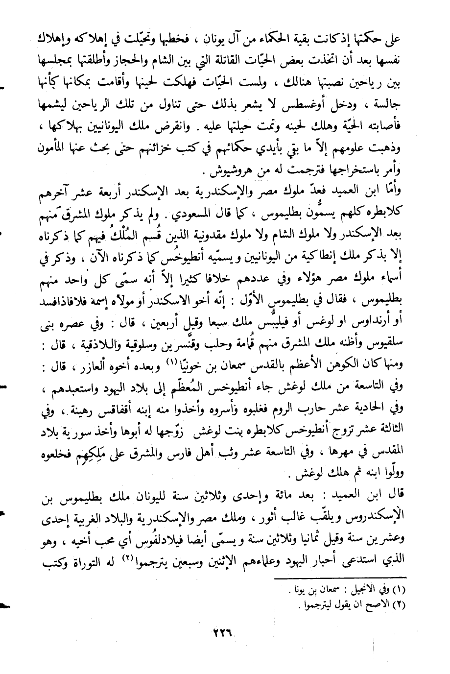 وأمّا ابن العميد فعدّ ملوك مصر والإسكندرية بعد الإسكندر أربعة عشر آخرهم كلابطره كلهم يسمّون بطليموس، كما قال المسعودي. ولم يذكر ملوك المشرق منهم بعد الإسكندر ولا ملوك الشام ولا ملوك مقدونية الذين قسم الملك فيهم كما ذكرناه إلا بذكر ملك أنطاكية من اليونانيين ويسمّيه أنطيوخس كما ذكرناه الآن، وذكر في أسماء ملوك مصر هؤلاء وفي عددهم خلافا كثيرا إلّا أنه سمّى كل واحد منهم بطليموس، فقال في بطليموس الأوّل: إنّه أخو الإسكندر أو مولاه اسمه فلافاذافسد أو أرنداوس أو لوغس أو فيليبس ملك سبعا وقيل أربعين، قال: وفي عصره بنى سلقيوس وأظنه ملك المشرق منهم قمامة وحلب وقنّسرين وسلوقية والاذقية، قال: