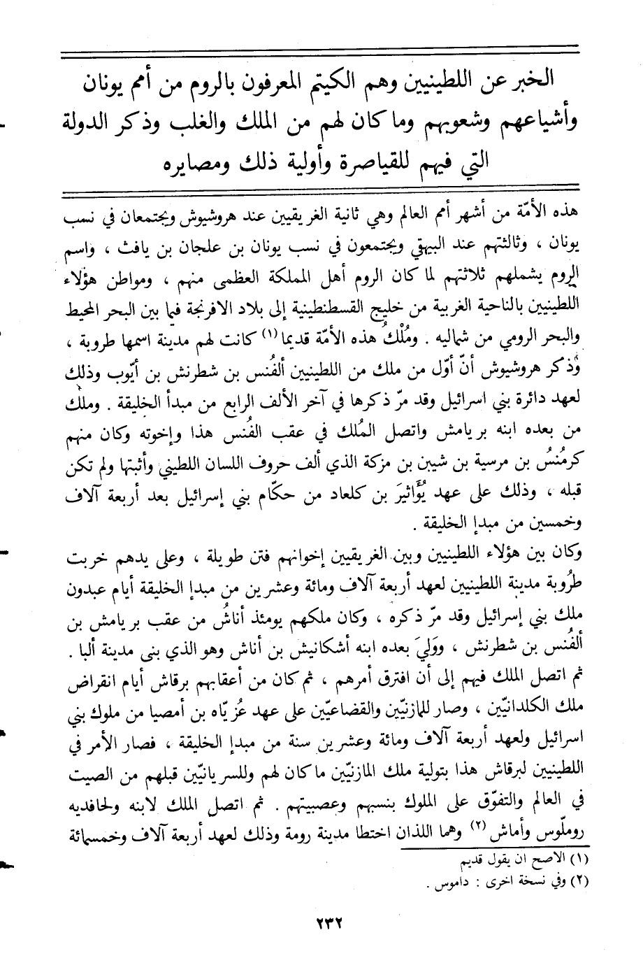 هذه الأمّة من أشهر أمم العالم وهي ثانية الغريقيين عند هروشيوش ويجتمعان في نسب يونان، وثالثتهم عند البيهقي ويجتمعون في نسب يونان بن علجان بن يافث، واسم الروم يشملهم ثلاثتهم لما كان الروم أهل المملكة العظمى منهم، ومواطن هؤلاء اللطينيين بالناحية الغربية من خليج القسطنطينية إلى بلاد الافرنجة فيما بين البحر المحيط والبحر الرومي من شماليه. وملك هذه الأمّة قديما [1] كانت لهم مدينة اسمها طروبة، وذكر هروشيوش أنّ أوّل من ملك من اللطينيين ألفنس بن شطرنش بن أيّوب وذلك لعهد دائرة بني إسرائيل وقد مرّ ذكرها في آخر الألف الرابع من مبدإ الخليقة. وملك من بعده ابنه بريامش واتصل الملك في عقب الفنس هذا وإخوته وكان منهم كرمنس بن مرسية بن شيبن بن مزكة الّذي ألف حروف اللسان اللطيني وأثبتها ولم تكن قبله، وذلك على عهد يؤاثير بن كلعاد من حكّام بني إسرائيل بعد أربعة آلاف وخمسين من مبدإ الخليقة.