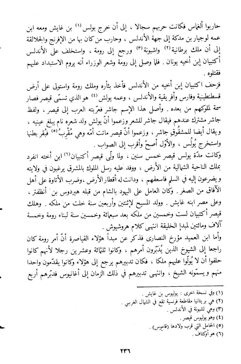 فزحف اكتبيان ابن أخيه من الأندلس فأخذ بثأره وملك رومة واستولى على أرض قسطنطينية وفارس وإفريقية والأندلس، وعمه يولش [4] هو الّذي تسمّى قيصر فصار سمة لملوكهم من بعده. وأصل هذا الاسم جاشر فعرّبته العرب إلى قيصر، ولفظ جاشر مشترك عندهم فيقال جاشر للشعر وزعموا أنّ يولش ولد شعره نام يبلغ عينيه، ويقال أيضا للمشقوق جاشر، وزعموا أنّ قيصر ماتت أمّه وهي مقرب [5] فبقر بطنها واستخرج يولس، والأوّل أصحّ وأقرب إلى الصواب.