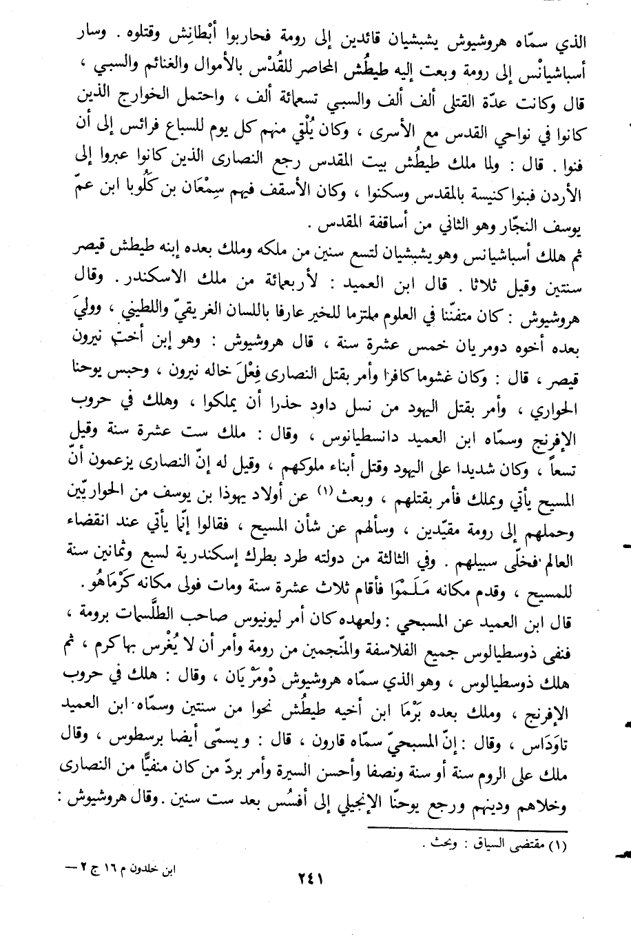 الّذي سمّاه هروشيوش يشبشيان قائدين إلى رومة فحاربوا أبطانش وقتلوه. وسار أسباشيانس إلى رومة وبعت إليه طيطش المحاصر للقدس بالأموال والغنائم والسبي، قال وكانت عدّة القتلى ألف ألف والسبي تسعمائة ألف، واحتمل الخوارج الذين كانوا في نواحي القدس مع الأسرى، وكان يلقي منهم كل يوم للسباع فرائس إلى أن فنوا. قال: ولما ملك طيطش بيت المقدس رجع النصارى الذين كانوا عبروا إلى الأردن فبنوا كنيسة بالمقدس وسكنوا، وكان الأسقف فيهم سمعان بن كلوبا ابن عمّ يوسف النجّار وهو الثاني من أساقفة المقدس.