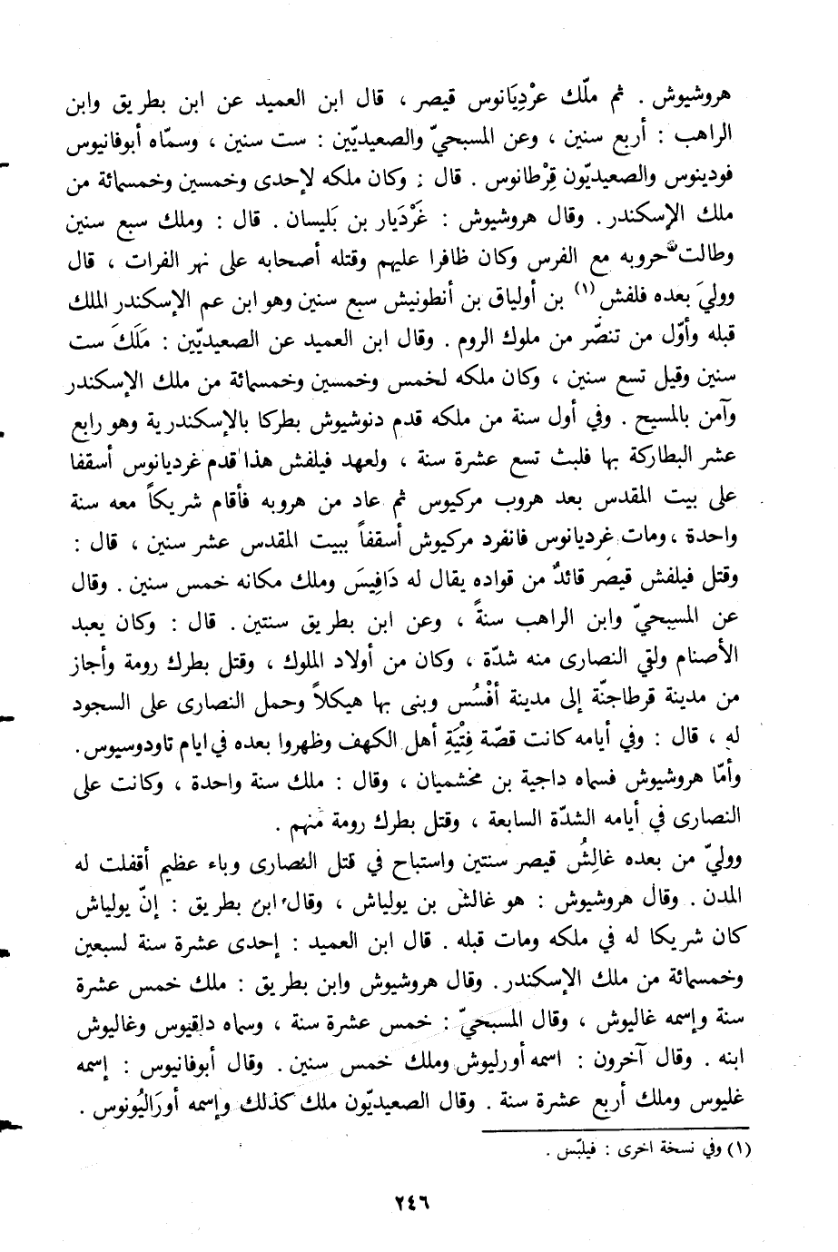 هروشيوش. ثم ملّك عرديانوس قيصر، قال ابن العميد عن ابن بطريق وابن الراهب: أربع سنين، وعن المسبحيّ والصعيديّين: ست سنين، وسمّاه أبو فانيوس فودينوس والصعيديّون قرطانوس. قال: وكان ملكه لإحدى وخمسين وخمسمائة من ملك الإسكندر. وقال هروشيوش: غرديار بن بليسان. قال: وملك سبع سنين وطالت حروبه مع الفرس وكان ظافرا عليهم وقتله أصحابه على نهر الفرات، قال وولي بعده فلفش [1] بن أولياق بن أنطونيش سبع سنين وهو ابن عم الإسكندر الملك قبله وأوّل من تنصّر من ملوك الروم. وقال ابن العميد عن الصعيديّين: ملك ست سنين وقيل تسع سنين، وكان ملكه لخمس وخمسين وخمسمائة من ملك الإسكندر وآمن بالمسيح. وفي أول سنة من ملكه قدم دنوشيوش بطركا بالإسكندرية وهو رابع عشر البطاركة بها فلبث تسع عشرة سنة، ولعهد فيلفش هذا قدم غرديانوس أسقفا على بيت المقدس بعد هروب مركيوس ثم عاد من هروبه فأقام شريكا معه سنة واحدة، ومات غرديانوس فانفرد مركيوش أسقفا ببيت المقدس عشر سنين، قال: