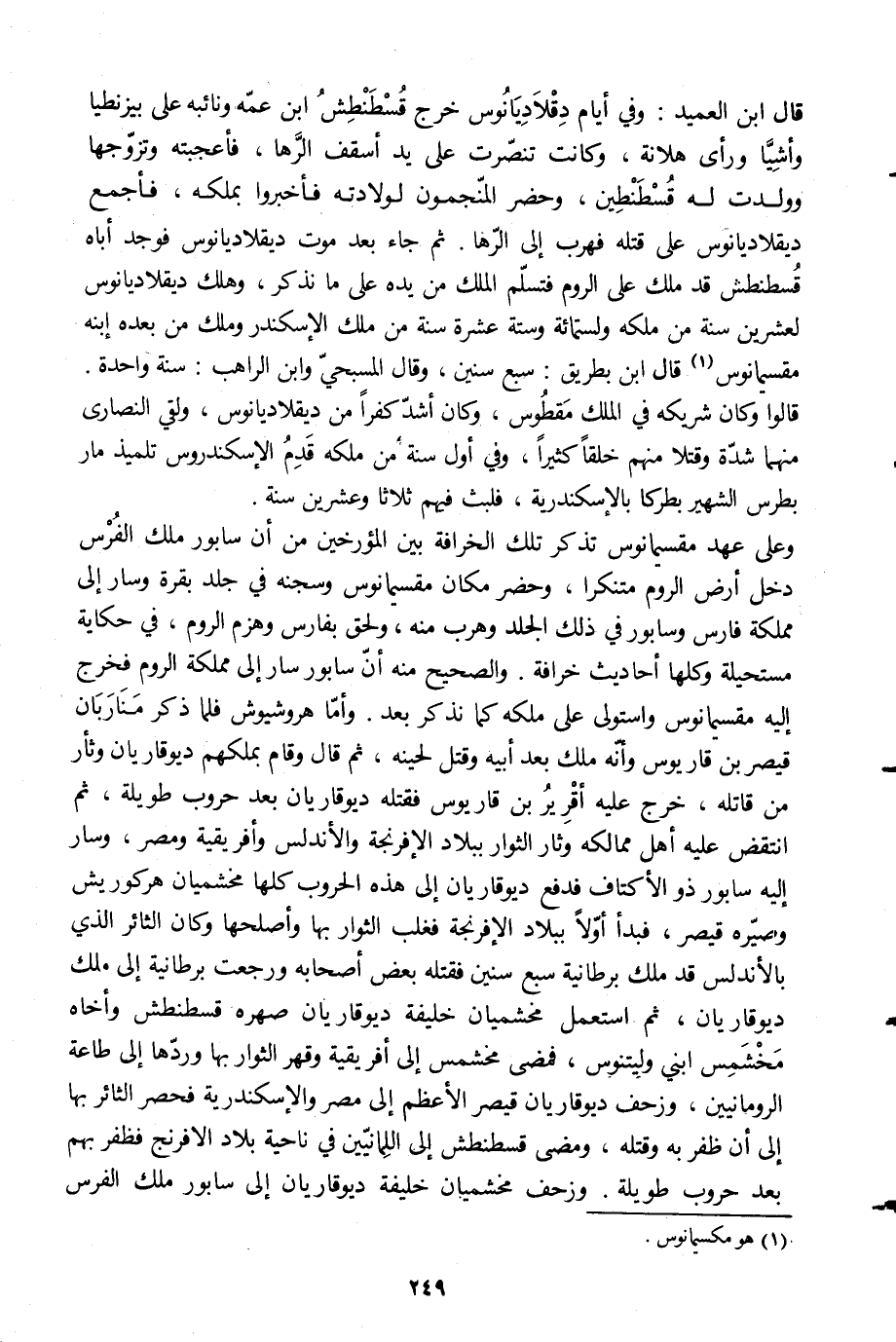 قال ابن العميد: وفي أيام دقلاديانوس خرج قسطنطش ابن عمّه ونائبة على بيزنطيا وأشيّا ورأى هلانة، وكانت تنصّرت على يد أسقف الرّها، فأعجبته وتزوّجها وولدت له قسطنطين، وحضر المنجّمون لولادته فأخبروا بملكه، فأجمع ديقلاديانوس على قتله فهرب إلى الرّها. ثم جاء بعد موت ديقلاديانوس فوجد أباه قسطنطش قد ملك على الروم فتسلّم الملك من يده على ما نذكر، وهلك ديقلاديانوس لعشرين سنة من ملكه ولستمائة وستة عشرة سنة من ملك الإسكندر وملك من بعده ابنه مقسيمانوس [1] قال ابن بطريق: سبع سنين، وقال المسبحيّ وابن الراهب: سنة واحدة.