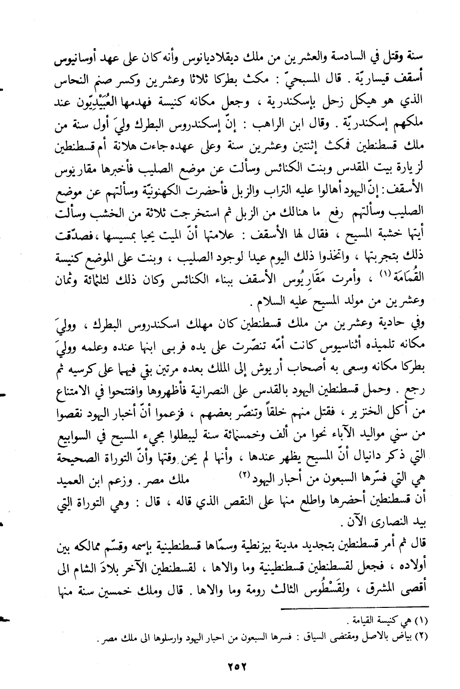 وفي حادية وعشرين من ملك قسطنطين كان مهلك إسكندروس البطرك، وولي مكانه تلميذه أثناسيوس كانت أمّه تنصّرت على يده فربى ابنها عنده وعلمه وولي بطركا مكانه وسعى به أصحاب أريوس إلى الملك بعده مرتين بقي فيهما على كرسيه ثم رجع. وحمل قسطنطين اليهود بالقدس على النصرانية فأظهروها وافتتحوا في الامتناع من أكل الخنزير، فقتل منهم خلقا وتنصّر بعضهم، فزعموا أنّ أخبار اليهود نقصوا من سني مواليد الآباء نحوا من ألف وخمسمائة سنة ليبطلوا مجيء المسيح في السوابيع التي ذكر دانيال أنّ المسيح يظهر عندها، وأنها لم يحن وقتها وأنّ التوراة الصحيحة هي التي فسّرها السبعون من أحبار اليهود [2] ملك مصر. وزعم ابن العميد أن قسطنطين أحضرها واطلع منها على النقض الّذي قاله، قال: وهي التوراة التي بيد النصارى الآن.