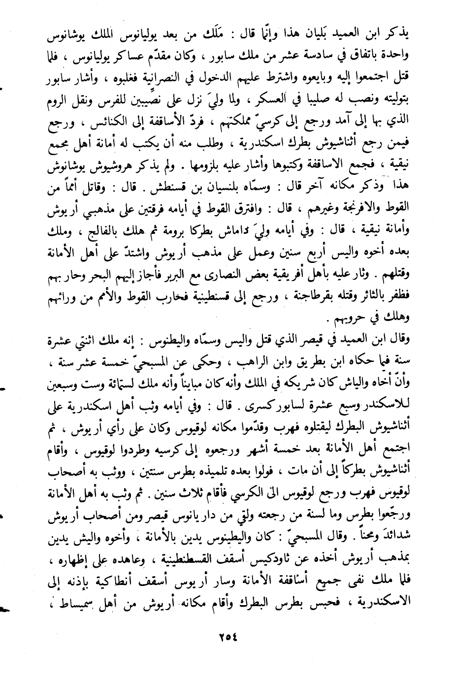 وقال ابن العميد في قيصر الّذي قتل واليس وسمّاه واليطنوس: إنه ملك اثنتي عشرة سنة فيما حكاه ابن بطريق وابن الراهب، وحكى عن المسبحيّ خمسة عشر سنة، وأنّ أخاه والياش كان شريكه في الملك وأنه كان مباينا وأنه ملك لستمائة وست وسبعين للإسكندر وسبع عشرة لسابور كسرى. قال: وفي أيامه وثب أهل اسكندرية على أثناشيوش البطرك ليقتلوه فهرب وقدّموا مكانه لوقيوس وكان على رأي أريوش، ثم اجتمع أهل الأمانة بعد خمسة أشهر ورجعوه إلى كرسيه وطردوا لوقيوس، وأقام أثناشيوش بطركا إلى أن مات، فولوا بعده تلميذه بطرس سنتين، ووثب به أصحاب لوقيوس فهرب ورجع لوقيوس الى الكرسي فأقام ثلاث سنين. ثم وثب به أهل الأمانة ورجّعوا بطرس وما لسنة من رجعته ولقي من داريانوس قيصر ومن أصحاب أريوش شدائد ومنحنا. وقال المسبحيّ: كان واليطينوس يديدن بالأمانة، وأخوه واليش يدين بمذهب أريوش أخذه عن ثاودكيس أسقف القسطنطينية، وعاهده على إظهاره، فلما ملك نفى جميع أساقفة الأمانة وسار أريوس اسقف أنطاكية بإذنه إلى الاسكندرية، فحبس بطرس البطرك وأقام مكانه أريوش من أهل سميساط،