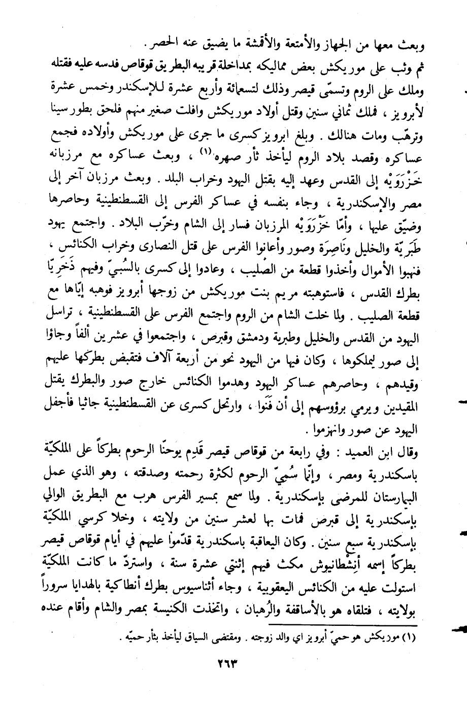 ثم وثب على موريكش بعض مماليكه بمداخلة قريبه البطريق قوقاص فدسه عليه فقتله وملك على الروم وتسمّى قيصر وذلك لتسعمائة وأربع عشرة للإسكندر وخمس عشرة لأبرويز، فملك ثماني سنين وقتل أولاد موريكش وأفلت صغير منهم فلحق بطور سينا وترهّب ومات هنالك. وبلغ أبرويز كسرى ما جرى على موريكش وأولاده فجمع عساكره وقصد بلاد الروم ليأخذ ثأر صهره [1] ، وبعث عساكره مع مرزبانه خزرويه إلى القدس وعهد إليه بقتل اليهود وخراب البلد. وبعث مرزبان آخر إلى مصر والإسكندرية، وجاء بنفسه في عساكر الفرس إلى القسطنطينية وحاصرها وضيّق عليها، وأمّا خزرويه المرزبان فسار إلى الشام وخرّب البلاد. واجتمع يهود طبريّة والخليل وناصرة وصور وأعانوا الفرس على قتل النصارى وخراب الكنائس، فنهبوا الأموال وأخذوا قطعة من الصليب، وعادوا إلى كسرى بالسبيّ وفيهم ذخريّا بطرك القدس، فاستوهبته مريم بنت موريكش من زوجها أبرويز فوهبه إيّاها مع قطعة الصليب. ولما خلت الشام من الروم واجتمع الفرس على القسطنطينية، تراسل اليهود من القدس والخليل وطبرية ودمشق وقبرص، واجتمعوا في عشرين ألفا وجاءوا إلى صور ليملكوها، وكان فيها من اليهود نحو من أربعة آلاف فتقبض بطركها عليهم وقيدهم، وحاصرهم عساكر اليهود وهدموا الكنائس خارج صور والبطرك يقتل المقيدين ويرمي برءوسهم إلى أن فنوا، وارتحل كسرى عن القسطنطينية جاثيا فأجفل اليهود عن صور وانهزموا.
