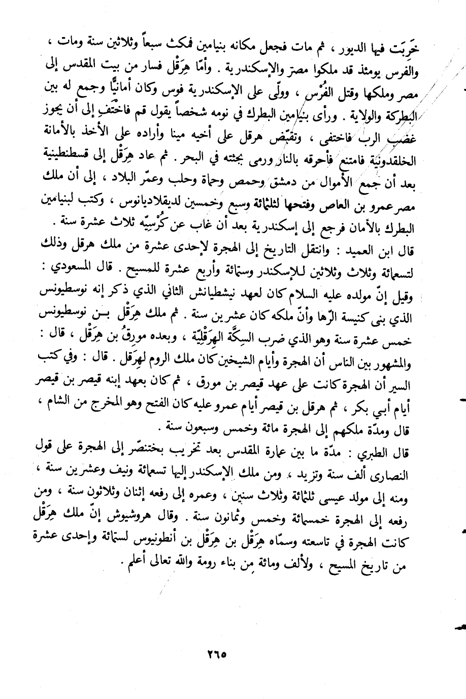 قال الطبري: مدّة ما بين عمارة المقدس بعد تخريب بخت نصّر إلى الهجرة على قول النصارى ألف سنة وتزيد، ومن ملك الإسكندر إليها تسعمائة ونيف وعشرين سنة، ومنه إلى مولد عيسى ثلاثمائة وثلاث سنين، وعمره إلى رفعه اثنان وثلاثون سنة، ومن رفعه إلى الهجرة خمسمائة وخمس وثمانون سنة. وقال هروشيوش إنّ ملك هرقل كانت الهجرة في تاسعته وسمّاه هرقل بن هرقل بن أنطونيوس لستمائة وإحدى عشرة من تاريخ المسيح، ولألف ومائة من بناء رومة والله تعالى أعلم.