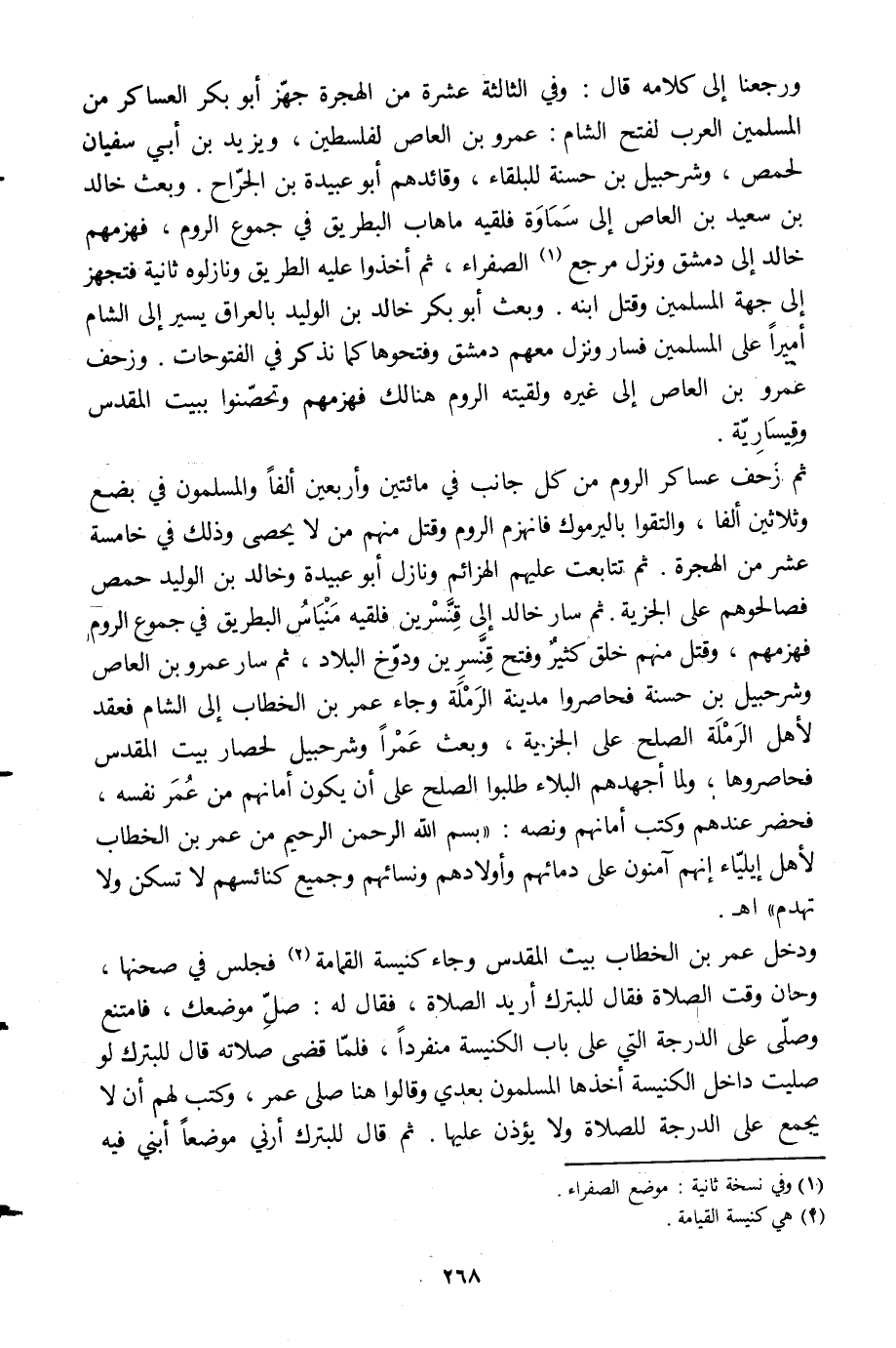 ثم زحف عساكر الروم من كل جانب في مائتين وأربعين ألفا والمسلمون في بضع وثلاثين ألفا، والتقوا باليرموك فانهزم الروم وقتل منهم من لا يحصى وذلك في خامسة عشر من الهجرة. ثم تتابعت عليهم الهزائم ونازل أبو عبيدة وخالد بن الوليد حمص فصالحوهم على الجزية. ثم سار خالد إلى قنّسرين فلقيه منياس البطريق في جموع الروم فهزمهم، وقتل منهم خلق كثير وفتح قنّسرين ودوّخ البلاد، ثم سار عمرو بن العاص وشرحبيل بن حسنة فحاصروا مدينة الرملة وجاء عمر بن الخطاب إلى الشام فعقد لأهل الرملة الصلح على الجزية، وبعث عمرا وشرحبيل لحصار بيت المقدس فحاصروها، ولما أجهدهم البلاء طلبوا الصلح على أن يكون أمانهم من عمر نفسه، فحضر عندهم وكتب أمانهم ونصه: «بسم الله الرحمن الرحيم من عمر بن الخطاب لأهل إيلياء إنهم آمنون على دمائهم وأولادهم ونسائهم وجميع كنائسهم لا تسكن ولا تهدم» أهـ.