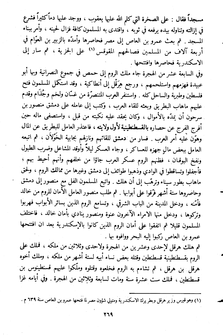 مسجدا فقال: على الصخرة التي كلم الله عليها يعقوب، ووجد عليها دما كثيرا فشرع في إزالته وتناوله بيده يرفعه في ثوبه، واقتدى به المسلمون كافة فزال لحينه، وأمر ببناء المسجد. ثم بعث عمرو بن العاص إلى مصر فحاصرها وأمدّه بالزبير بن العوام في أربعة آلاف من المسلمين فصالحهم المقوقس [1] على الجزية، ثم سار إلى الاسكندرية فحاصرها وافتتحها.