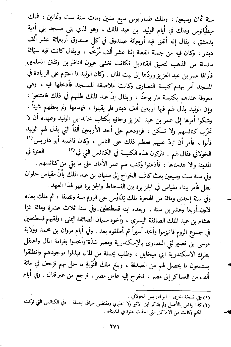 سنة ثمان وسبعين، وملك طيباريوس سبع سنين ومات سنة ست وثمانين، فملك سطيانوس وذلك في أيام الوليد بن عبد الملك، وهو الّذي بنى مسجد بني أمية بدمشق، يقال إنه أنفق فيه أربعمائة صندوق في كل صندوق أربعمائة عشر ألف دينار، وكان فيه من جملة الفعلة اثنا عشر ألف مرخّم، ويقال كانت فيه ستمائة سلسلة من الذهب لتعليق القناديل فكانت تغشى عيون الناظرين وتفتن المسلمين فأزالها عمر بن عبد العزيز وردّها إلى بيت المال. وكان الوليد لما اعتزم على الزيادة في المسجد أمر بهدم كنيسة النصارى وكانت ملاصقة للمسجد فأدخلها فيه، وهي معروفة عندهم بكنيسة مار يوحنّا، ويقال إنّ عبد الملك طلبهم في ذلك فامتنعوا، وإن الوليد بذل لهم فيها أربعين ألف دينار فلم يقبلوا، فهدمها ولم يعطهم شيئا، وشكوا أمرها إلى عمر بن عبد العزيز وجاءوه بكتاب خالد بن الوليد وعهده أن لا تخرّب كنائسهم ولا تسكن، فراودهم على أخذ الأربعين ألفا التي بذل لهم الوليد فأبوا، فأمر أن تردّ عليهم فعظم ذلك على الناس، وكان قاضيه أبو داريس [1] الخولانيّ فقال لهم: تتركون هذه الكنيسة في الكنائس التي في [2] العنوة في المدينة وإلا هدمناها، فأذعنوا وكتب لهم عمر الأمان على ما بقي من كنائسهم.