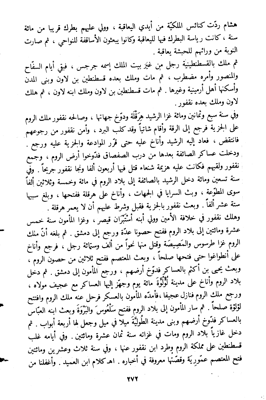 وهلك نقفور في خلافة الأمين وولي ابنه أستبران قيصر، وغزا المأمون سنة خمس عشرة ومائتين إلى بلاد الروم ففتح حصونا عدّة ورجع إلى دمشق. ثم بلغه أنّ ملك الروم غزا طرسوس والمصيصة وقتل منها نحوا من ألف وستمائة رجل، فرجع وأناخ على أنطواغوا حتى فتحها صلحا، وبعث المعتصم ففتح ثلاثين من حصون الروم، وبعث يحيى بن أكثم بالعساكر فدوّخ أرضهم، ورجع المأمون إلى دمشق. ثم دخل بلاد الروم وأناخ على مدينة لؤلؤة مائة يوم وجهّز إليها العساكر مع عجيف مولاه، ورجع ملك الروم فنازل عجيفا، فأمدّه المأمون بالعسكر فرحل عنه ملك الروم وافتتح لؤلؤة صلحا. ثم سار المأمون إلى بلاد الروم ففتح سلعوس والبروة وبعث ابنه العبّاس بالعساكر فدوّخ أرضهم وبنى مدينة الطوليّة ميلاد في ميل وجعل لها أربعة أبواب. ثم دخل غازيا بلاد الروم ومات في غزاته سنة ثمان عشرة ومائتين. وفي أيامه غلب قسطنطين على مملكة الروم وطرد ابن نقفور عنها، وفي سنة ثلاث وعشرين ومائتين فتح المعتصم عمّورية وقصّتها معروفة في أخباره. أهـ كلام ابن العميد. وأغفلنا من