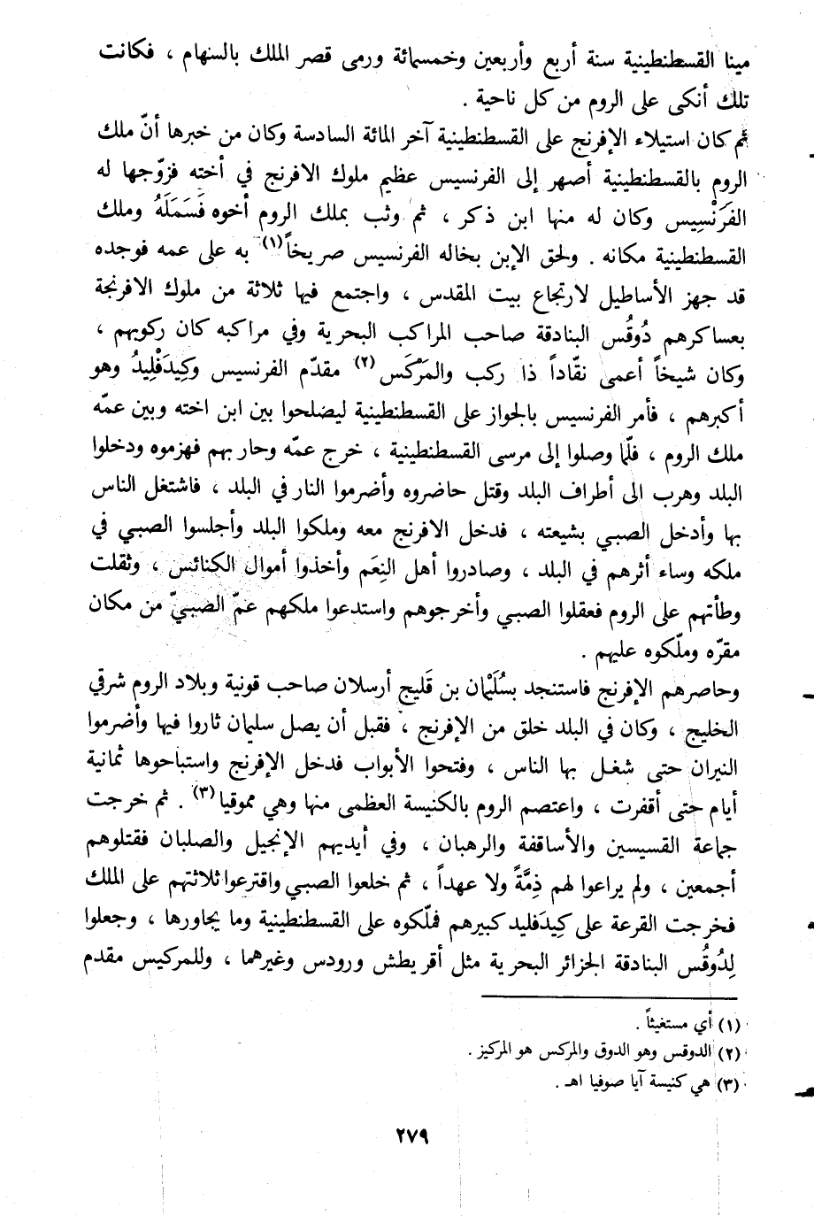ثم كان استيلاء الإفرنج على القسطنطينية آخر المائة السادسة وكان من خبرها أنّ ملك الروم بالقسطنطينية أصهر إلى الفرنسيس عظيم ملوك الافرنج في أخته فزوّجها له الفرنسيس وكان له منها ابن ذكر، ثم وثب بملك الروم أخوه فسمله وملك القسطنطينية مكانه. ولحق الابن بخاله الفرنسيس صريخا [1] به على عمه فوجده قد جهز الأساطيل الارتجاع بيت المقدس، واجتمع فيها ثلاثة من ملوك الافرنجة بعساكرهم دوقس البنادقة صاحب المراكب البحرية وفي مراكبه كان ركوبهم، وكان شيخا أعمى نقّادا ذا ركب والمركس [2] مقدّم الفرنسيس وكيدفليد وهو أكبرهم، فأمر الفرنسيس بالجواز على القسطنطينة ليصلحوا بين ابن أخته وبين عمّه ملك الروم، فلمّا وصلوا إلى مرسى القسطنطينية، خرج عمّه وحار بهم فهزموه ودخلوا البلد وهرب الى أطراف البلد وقتل حاضروه وأضرموا النار في البلد، فاشتغل الناس بها وأدخل الصبي بشيعته، فدخل الافرنج معه وملكوا البلد وأجلسوا الصبي في ملكه وساء أثرهم في البلد، وصادروا أهل النعم وأخذوا أموال الكنائس، وثقلت ووطأتهم على الروم فعقلوا الصبي وأخرجوهم واستدعوا ملكهم عمّ الصبيّ من مكان مقرّه وملّكوه عليهم.