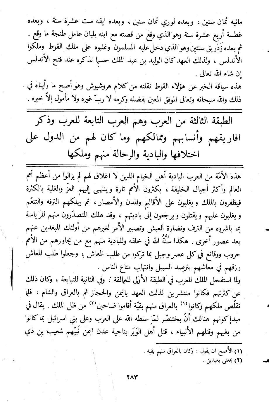 الطبقة الثالثة من العرب وهم العرب التابعة للعرب وذكر افاريقهم وأنسابهم وممالكهم وما كان لهم من الدول على اختلافها والبادية والرحالة منهم وملكها