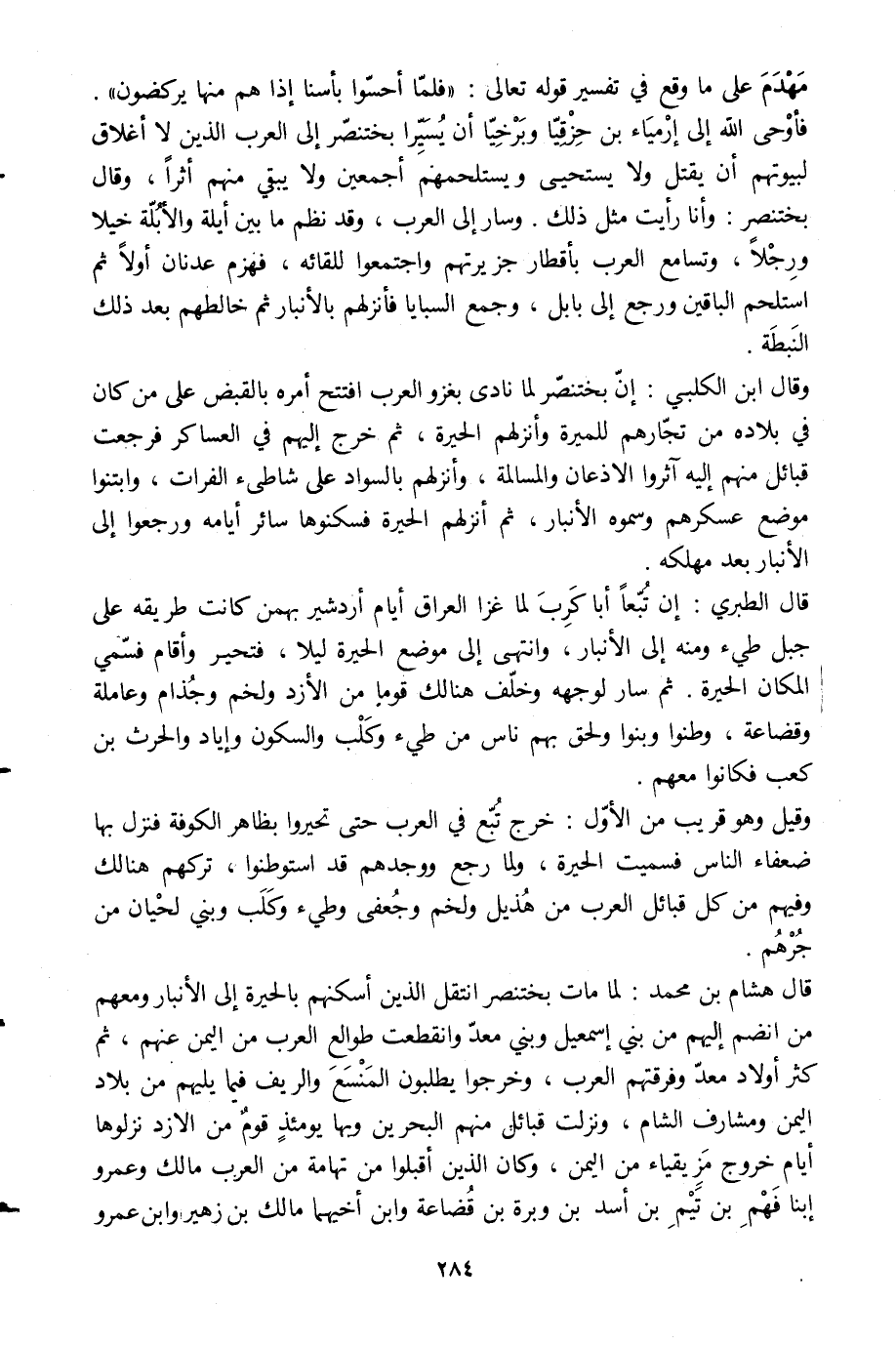فأوحى الله إلى إرمياء بن حزقيّا وبرخيا أن يسيّرا بخت نصّر إلى العرب الذين لا أغلاق لبيوتهم أن يقتل ولا يستحيى ويستلحمهم أجمعين ولا يبقى منهم أثرا، وقال بخت نصّر: وأنا رأيت مثل ذلك. وسار إلى العرب، وقد نظم ما بين أيلة والأبلّة خيلا ورجلا، وتسامع العرب بأقطار جزيرتهم واجتمعوا للقائه، فهزم عدنان أولا ثم استلحم الباقين ورجع إلى بابل، وجمع السبايا فأنزلهم بالأنبار ثم خالطهم بعد ذلك النبطة.