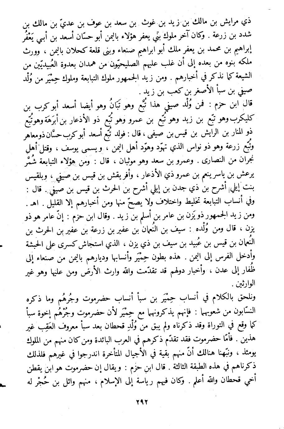 ونلحق بالكلام في أنساب حمير بن سبإ أنساب حضرموت وجرهم وما ذكره النسّابون من شعوبهما: فإنّهم يذكرونهما مع حمير لأن حضرموت وجرهم إخوة سبإ كما وقع في التوراة وقد ذكرناه ولم يبق من ولد قحطان بعد سبإ معروف العقب غير هذين. فأمّا حضرموت فقد تقدّم ذكرهم في العرب البائدة ومن كان منهم من الملوك يومئذ، ونبّهنا هنالك أنّ منهم بقية في الأجيال المتأخرة اندرجوا في غيرهم فلذلك ذكرناهم في هذه الطبقة الثالثة. قال ابن حزم: ويقال إن حضرموت هو ابن يقطن أخي قحطان والله أعلم. وكان فيهم رياسة إلى الإسلام، منهم وائل بن حجر له