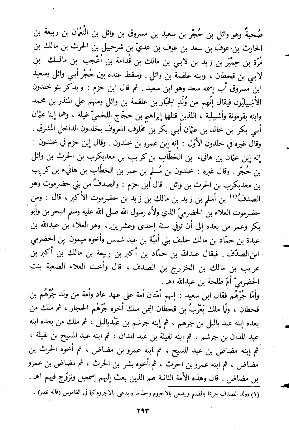 صحبة وهو وائل بن حجر بن سعيد بن مسروق بن وائل بن النعمان بن ربيعة بن الحارث بن عوف بن سعد بن عوف بن عديّ بن شرحبيل بن الحرث بن مالك بن مرّة بن حمير بن زيد بن لابي بن مالك بن قدامة بن أعجب بن مالك بن لابي بن قحطان، وابنه علقمة بن وائل. وسقط عنده بين حجر أبي وائل وسعيد ابن مسروق أب اسمه سعد وهو ابن سعيد. ثم قال ابن حزم: ويذكر بنو خلدون الإشبيليّون فيقال إنّهم من ولد الجبّار بن علقمة بن وائل ومنهم علي المنذر بن محمد وابنه بقرمونة وإشبيليّة، اللذين قتلهما إبراهيم بن حجّاج اللخميّ غيلة، وهما ابنا عثمان أبي بكر بن خالد بن عثمان أبي بكر بن مخلوف المعروف بخلدون الداخل المشرق.