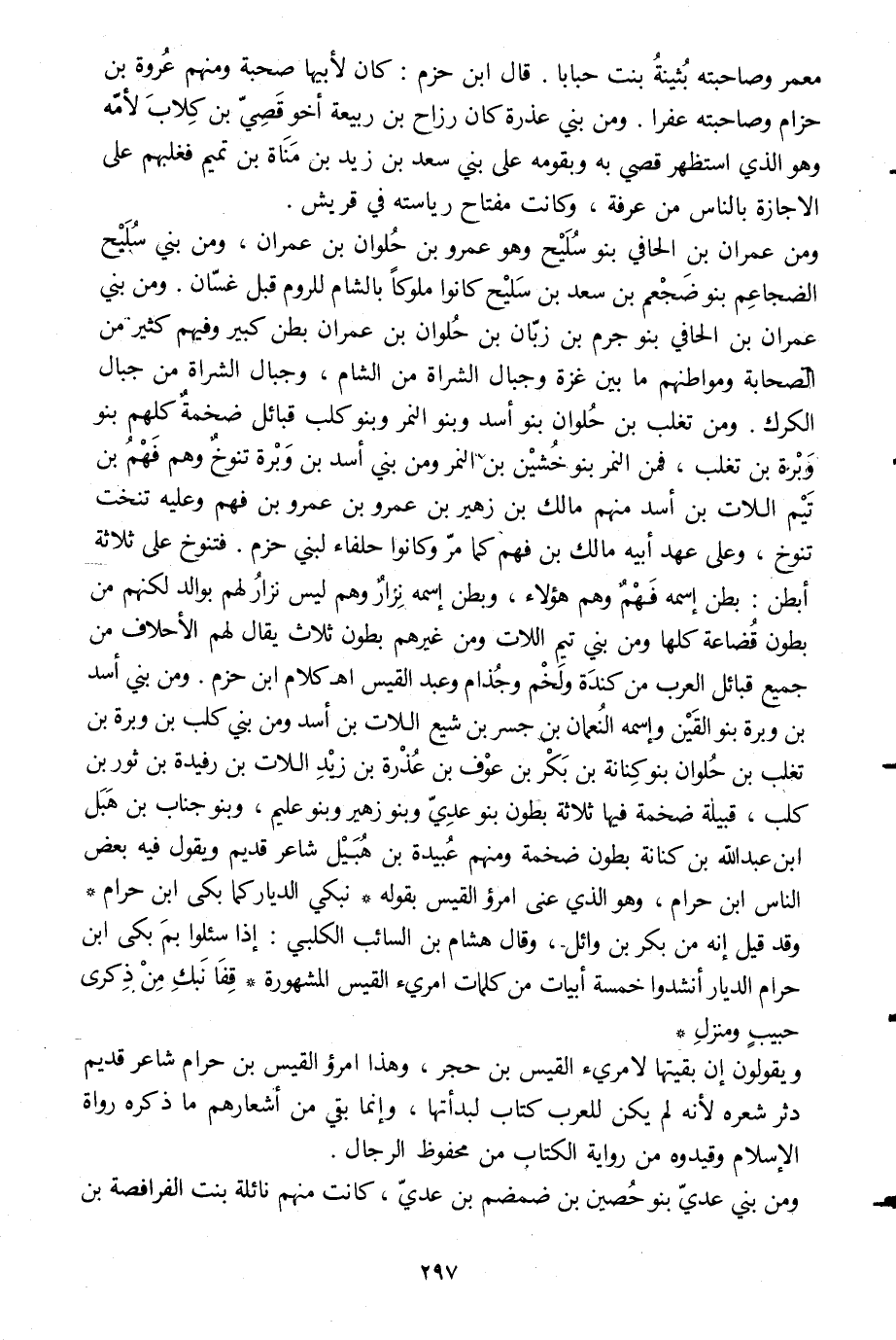 ومن عمران بن الحافي بنو سليح وهو عمرو بن حلوان بن عمران، ومن بني سليح الضجاعم بنو ضجعم بن سعيد بن سليح كانوا ملوكا بالشام للروم قبل غسّان. ومن بني عمران بن الحافي بنو جرم بن زبّان بن حلوان بن عمران بطن كبير وفيهم كثير من الصحابة ومواطنهم ما بين غزة وجبال الشراة من الشام، وجبال الشراة من جبال الكرك. ومن تغلب بن حلوان بنو أسد وبنو النمر وبنو كلب قبائل ضخمة كلهم بنو وبرة بن تغلب، فمن النمر بن خشين بن النمر ومن بني أسد بن وبرة تنوخ وهم فهم بن تيم اللات بن أسد منهم مالك بن زهير بن عمرو بن عمرو بن فهم وعليه تنخت تنوخ، وعلى عهد أبيه مالك بن فهم كما مرّ وكانوا حلفاء لبني حزم. فتنوخ على ثلاثة أبطن: بطن اسمه فهم وهم هؤلاء، وبطن اسمه نزار وهم ليس نزار لهم بوالد لكنهم من بطون قضاعة كلها ومن بني تيم اللات ومن غيرهم بطون ثلاث يقال لهم الأحلاف من جميع قبائل العرب من كندة ولخم وجذام وعبد القيس أهـ كلام ابن حزم. ومن بني أسد بن وبرة بنو القين واسمه النعمان بن جسر بن شيع اللات بن أسد ومن بني كلب بن وبرة بن تغلب بن حلوان بنو كنانة بن بكر بن عوف بن عذرة بن زيد اللات بن رفيدة بن ثور بن كلب، قبيلة ضخمة فيها ثلاثة بطون بنو عديّ وبنو زهير وبنو عليهم، وبنو جناب بن هبل ابن عبد الله بن كنانة بطون ضخمة ومنهم عبيدة بن هبيل شاعر قديم ويقول فيه بعض الناس ابن حرام، وهو الّذي عنى امرؤ القيس بقوله نبكي الديار كما بكى ابن حرام وقد قيل إنه من بكر بن وائل، وقال هشام بن السائب الكلبي: إذا سئلوا بم بكى ابن حرام الديار أنشدوا خمسة أبيات من كلمات امرئ القيس المشهورة قفا نبك من ذكرى حبيب ومنزل ويقولون إن بقيتها لامرئ القيس بن حجر، وهذا امرؤ القيس بن حرام شاعر قديم دثر شعره لأنه لم يكن للعرب كتاب لبدأتها، وإنما بقي من أشعارهم ما ذكره رواة الإسلام وقيدوه من رواية الكتاب من محفوظ الرجال.