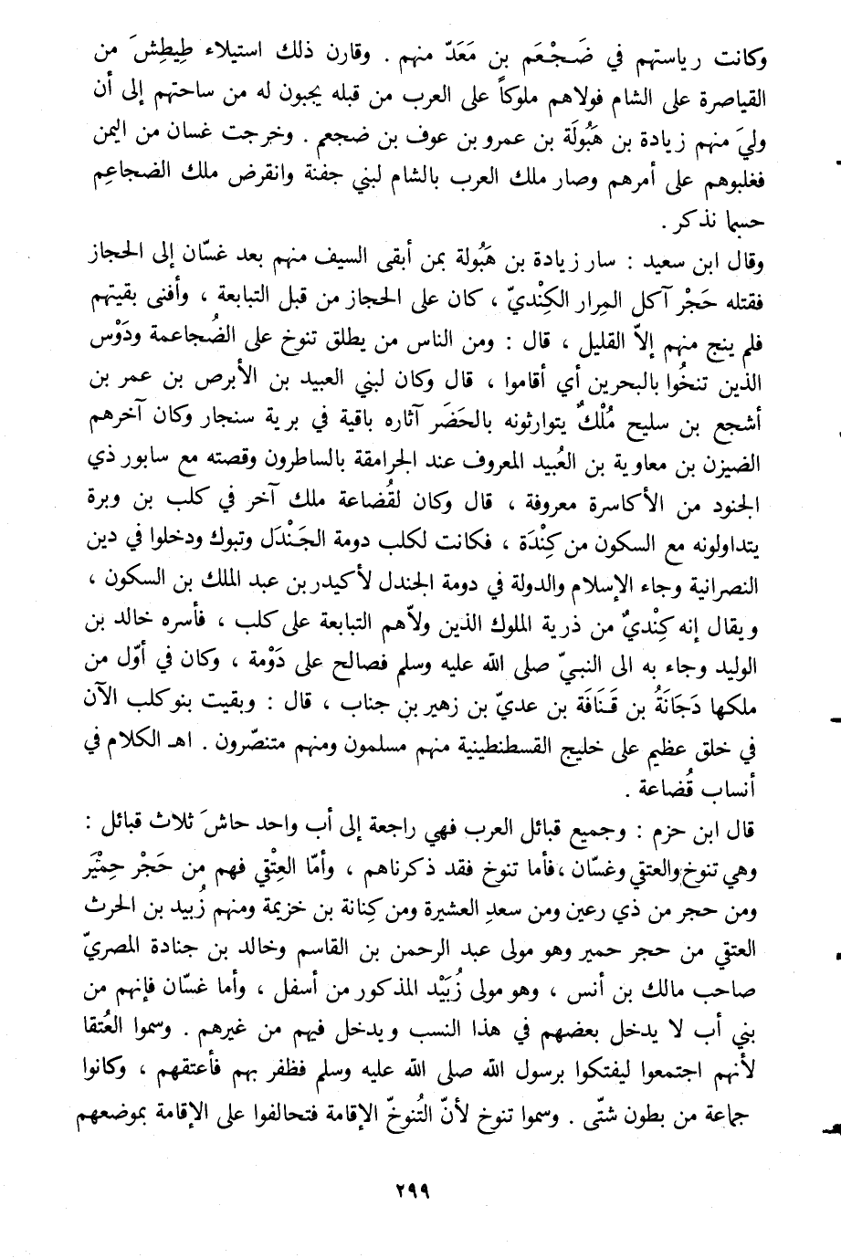 وقال ابن سعيد: سار زيادة بن هبولة بمن أبقى السيف منهم بعد غسّان إلى الحجاز فقتله حجر آكل المرار الكنديّ، كان على الحجاز من قبل التبابعة، وأفنى بقيتهم فلم ينج منهم إلّا القليل، قال: ومن الناس من يطلق تنوخ على الضجاعمة ودوس الذين تنخوا بالبحرين أي أقاموا، قال وكان لبني العبيد بن الأبرص بن عمر بن أشجع بن سليح ملك يتوارثونه بالحضر آثاره باقية في برية سنجار وكان آخرهم الضيزن بن معاوية بن العبيد المعروف عند الجرامقة بالساطرون وقصته مع سابور ذي الجنود من الأكاسرة معروفة، قال وكان لقضاعة ملك آخر في كلب بن وبرة يتداولونه مع السكون من كندة، فكانت لكلب دومة الجندل وتبوك ودخلوا في دين النصرانية وجاء الإسلام الدولة في دومة الجندل لأكيدر بن عبد الملك بن السكون، ويقال إنه كندي من ذرية الملوك الذين ولّاهم التبابعة على كلب، فأسره خالد بن الوليد وجاء به الى النبيّ صلى الله عليه وسلم فصالح على دومة، وكان في أوّل من ملكها دجانة بن قنافة بن عديّ بن زهير بن جناب، قال: وبقيت بنو كلب الآن في خلق عظيم على خليج القسطنطينية منهم مسلمون ومنهم متنصّرون. أهـ الكلام في أنساب قضاعة.