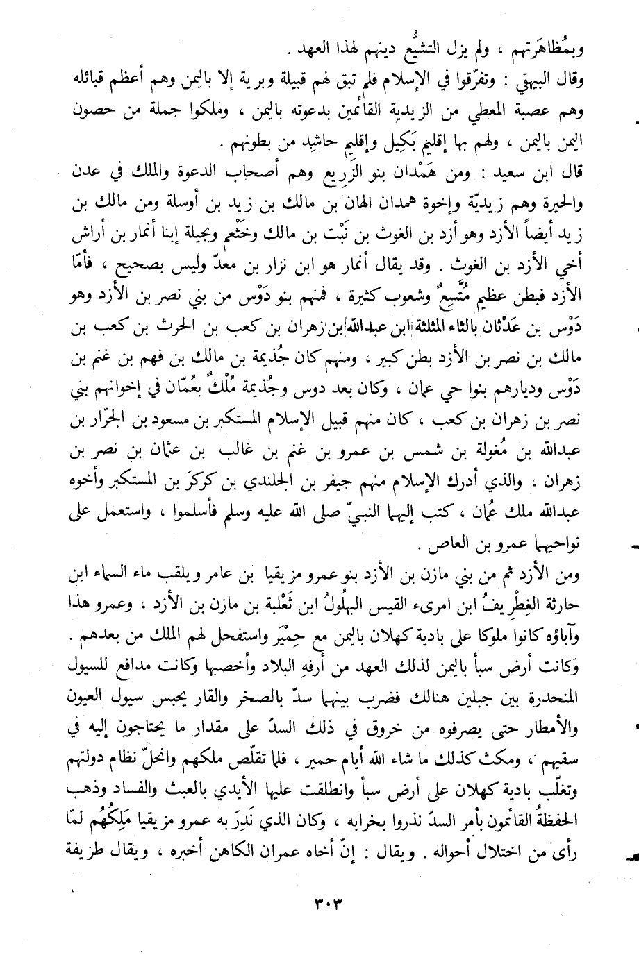 قال ابن سعيد: ومن همدان بنو الزريع وهم أصحاب الدعوة والملك في عدن والحيرة وهم زيديّة وإخوة همدان إلهان بن مالك بن زيد بن أوسلة ومن مالك بن زيد أيضا الأزد وهو أزد بن الغوث بن نبت بن مالك وخثعم وبجيلة ابنا أنمار بن أراش أخي الأزد بن الغوث. وقد يقال أنمار هو ابن نزار بن معدّ وليس بصحيح، فأمّا الأزد فبطن عظيم متّسع وشعوب كثيرة، فمنهم بنو دوس من بني نصر بن الأزد وهو دوس بن عدثان بالثاء المثلثة ابن عبد الله بن زهران بن كعب بن الحرث بن كعب بن مالك بن نصر بن الأزد بطن كبير، ومنهم كان جذيمة بن مالك بن فهم بن غنم بن دوس وديارهم بنواحي عمان، وكان بعد دوس وجذيمة ملك بعمّان في إخوانهم بني نصر بن زهران بن كعب، كان منهم قبيل الإسلام المستكبر بن مسعود بن الجرّار بن عبد الله بن مغولة بن شمس بن عمرو بن غنم بن غالب بن عثمان بن نصر بن زهران، والّذي أدرك الإسلام منهم جيفر بن الجلندي بن كركر بن المستكبر وأخوه عبد الله ملك عمان، كتب إليهما النبيّ صلى الله عليه وسلم فأسلموا، واستعمل على نواحيهما عمرو بن العاص.